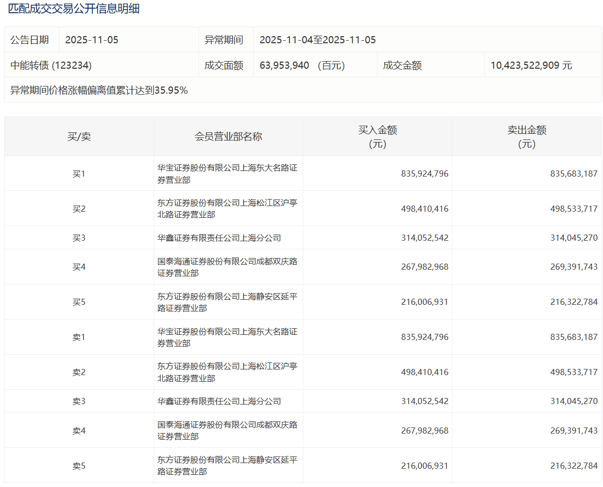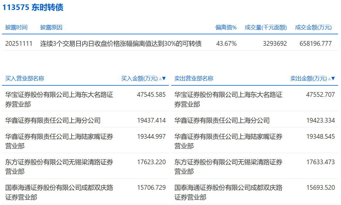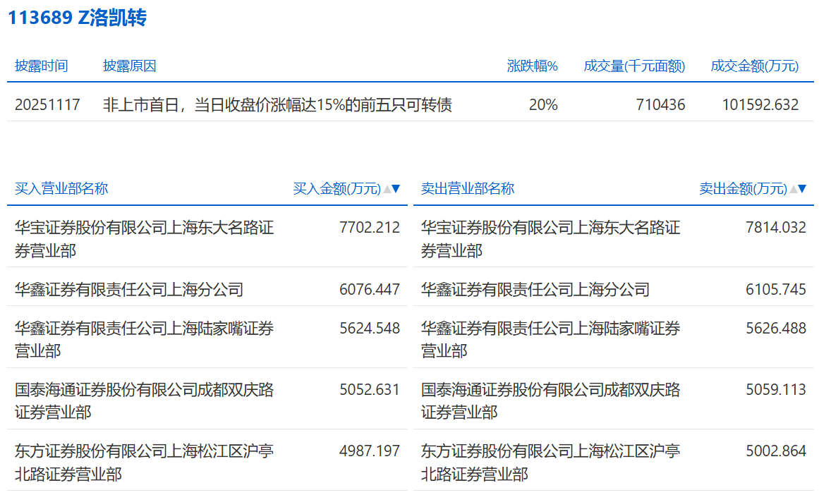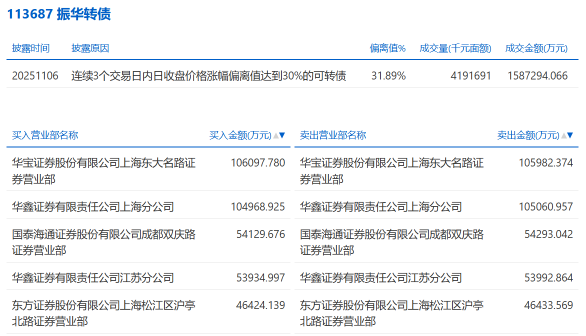 2025年11月6日,上交所可转债龙虎榜有1支转债,深交所可转债龙虎榜有1支转债。