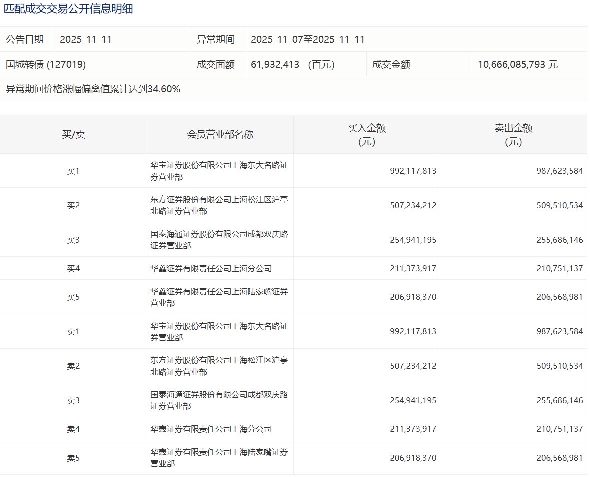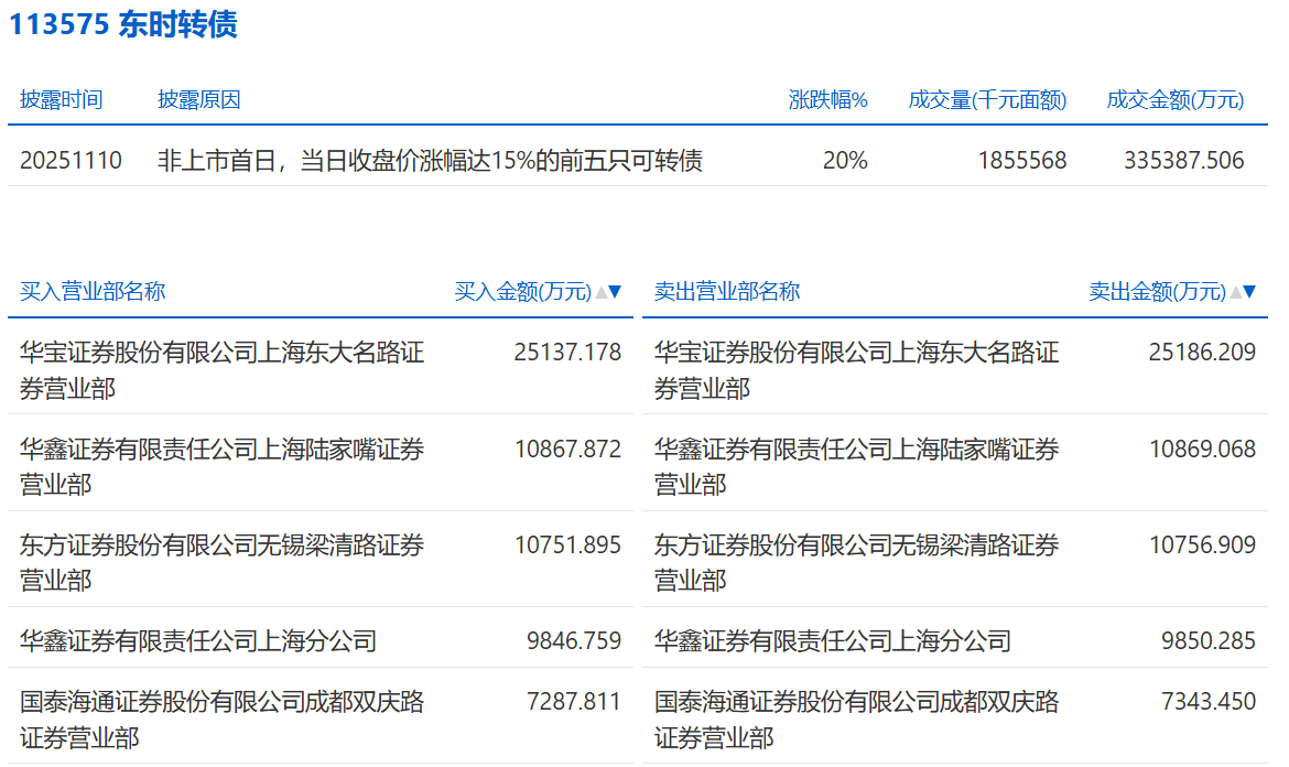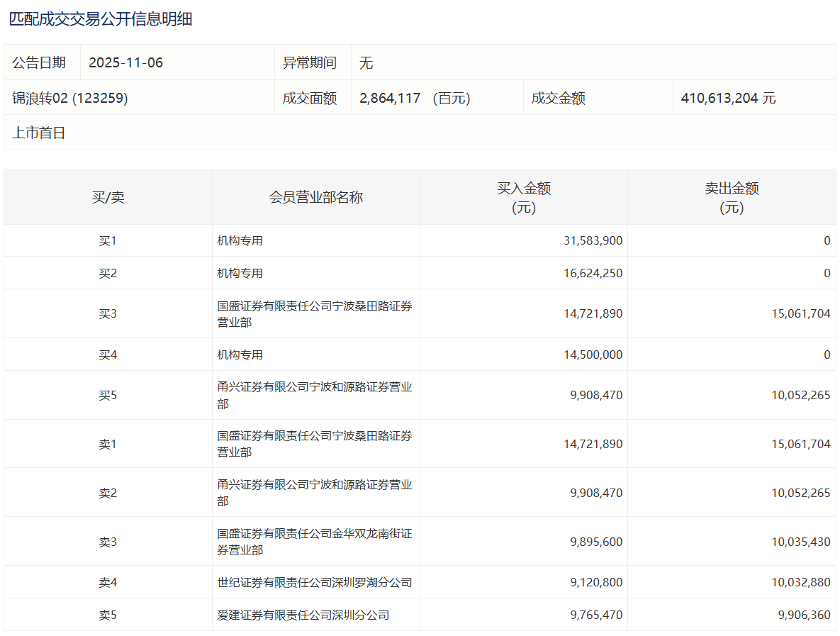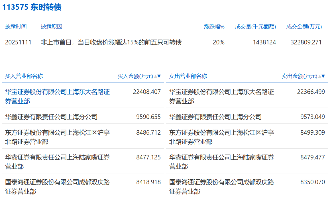 2025年11月6日,上交所可转债龙虎榜有1支转债,深交所可转债龙虎榜有1支转债。