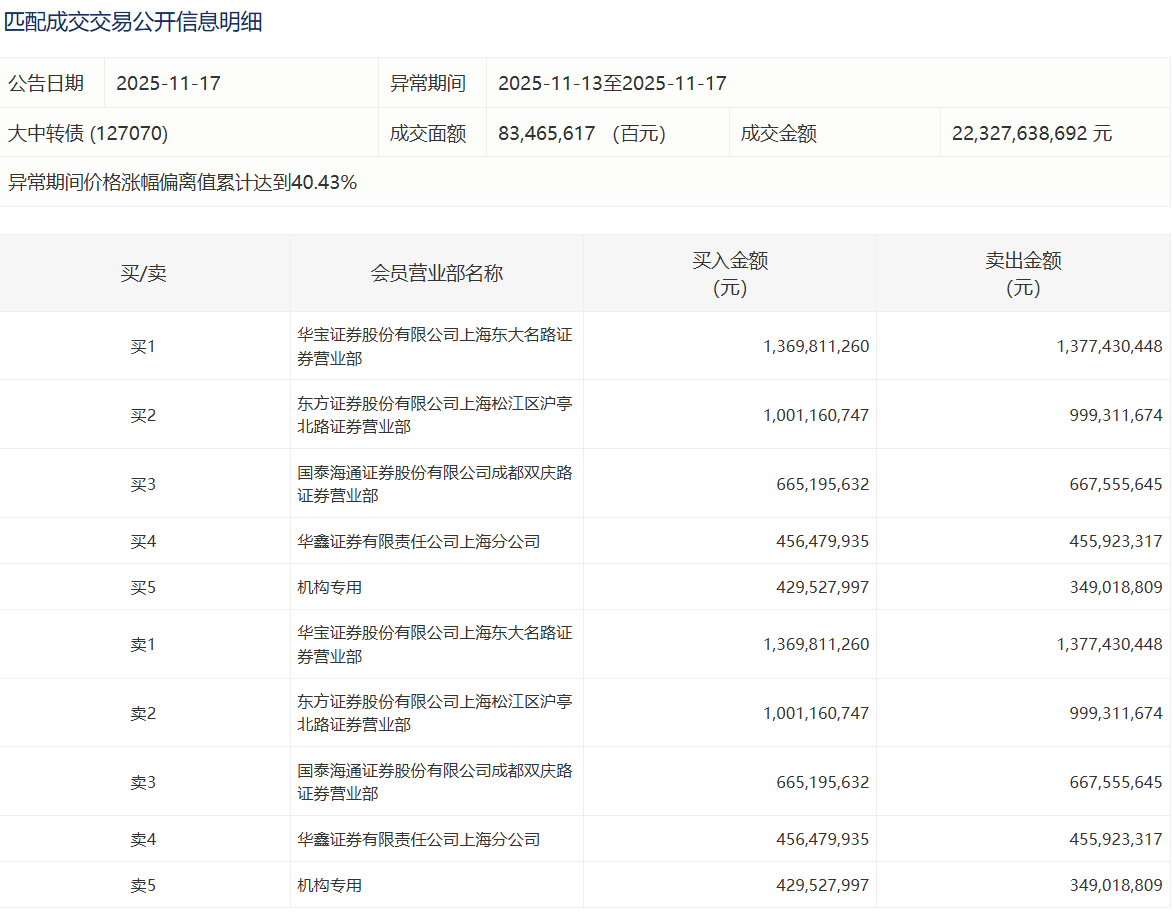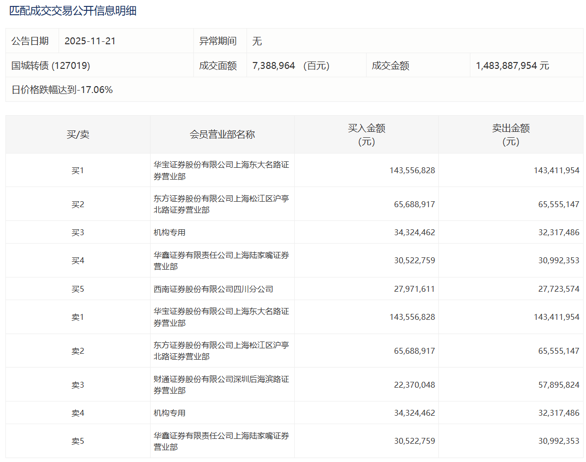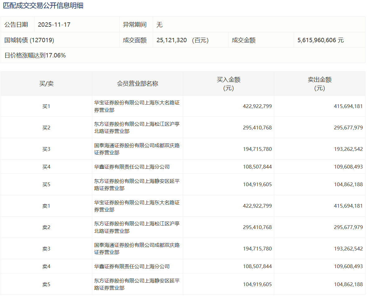 2025年11月17日,上交所可转债龙虎榜有1支转债,深交所可转债龙虎榜有2支转债。