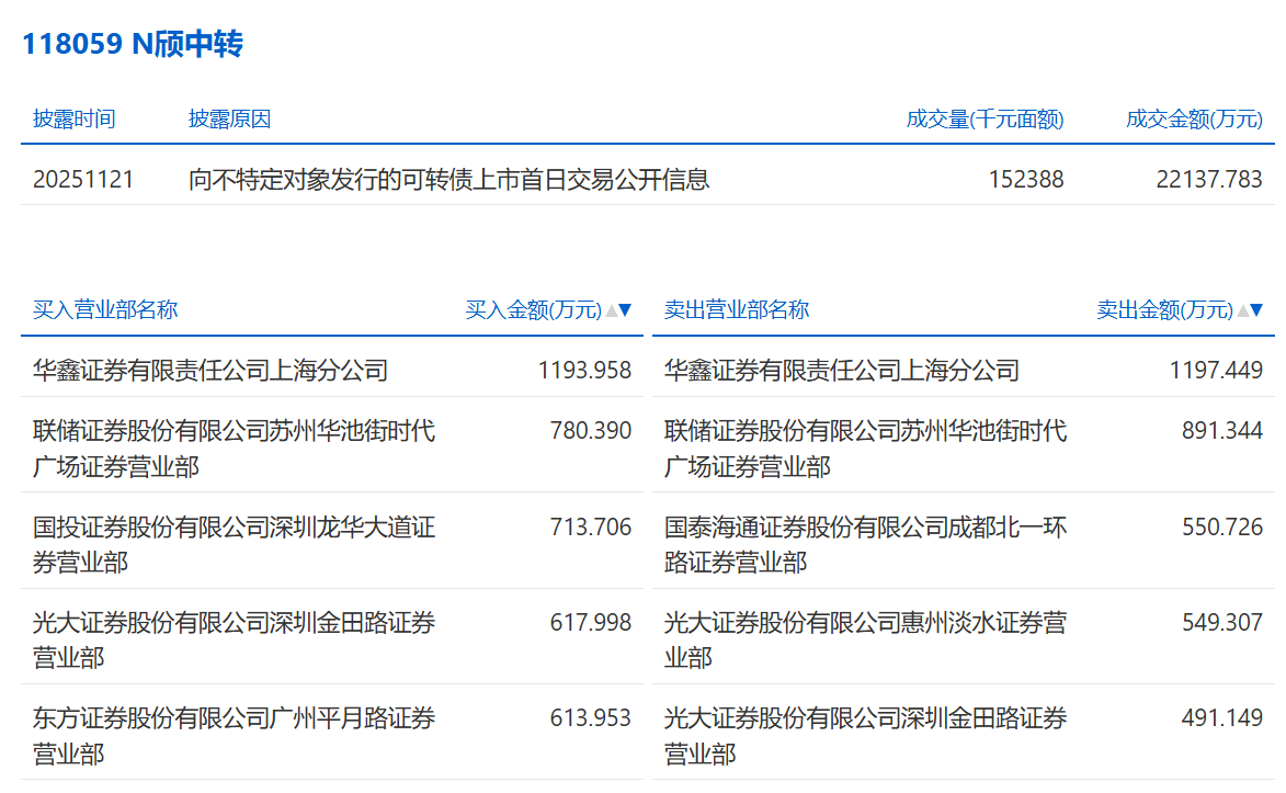 2025年11月21日,上交所可转债龙虎榜有1支转债,深交所可转债龙虎榜有1支转债。
