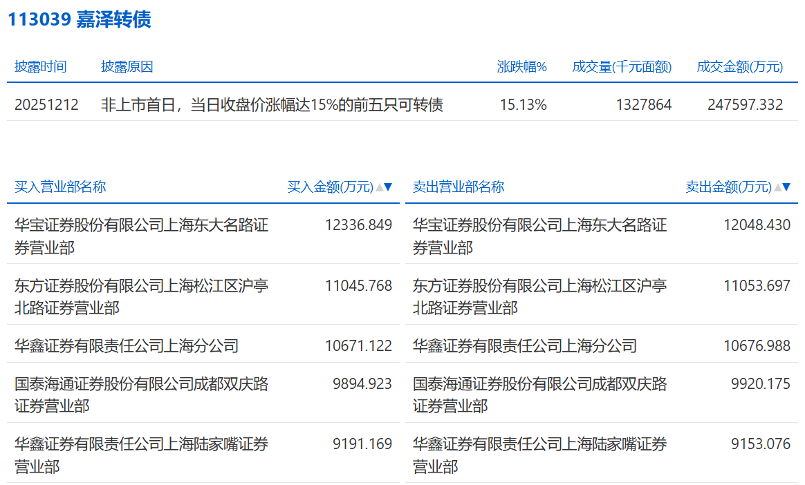 2025年12月12日,上交所可转债龙虎榜有2支转债。
