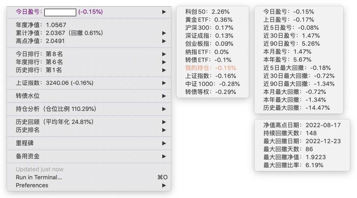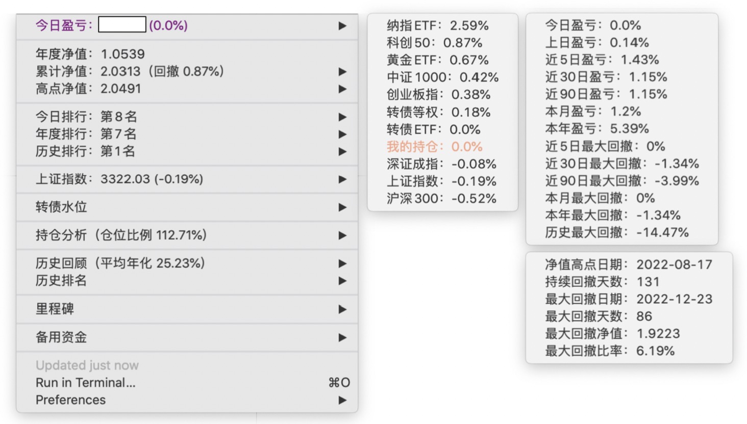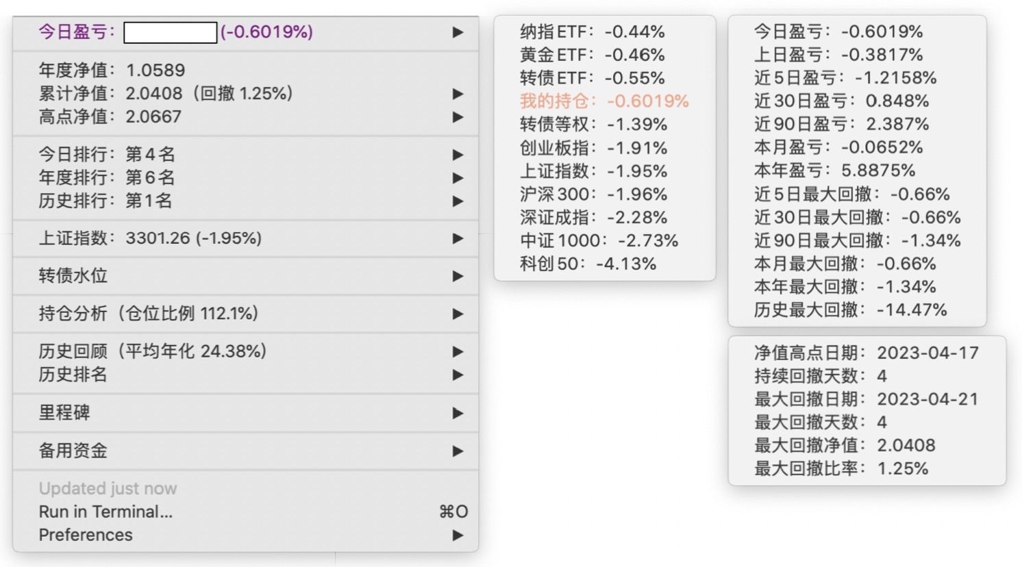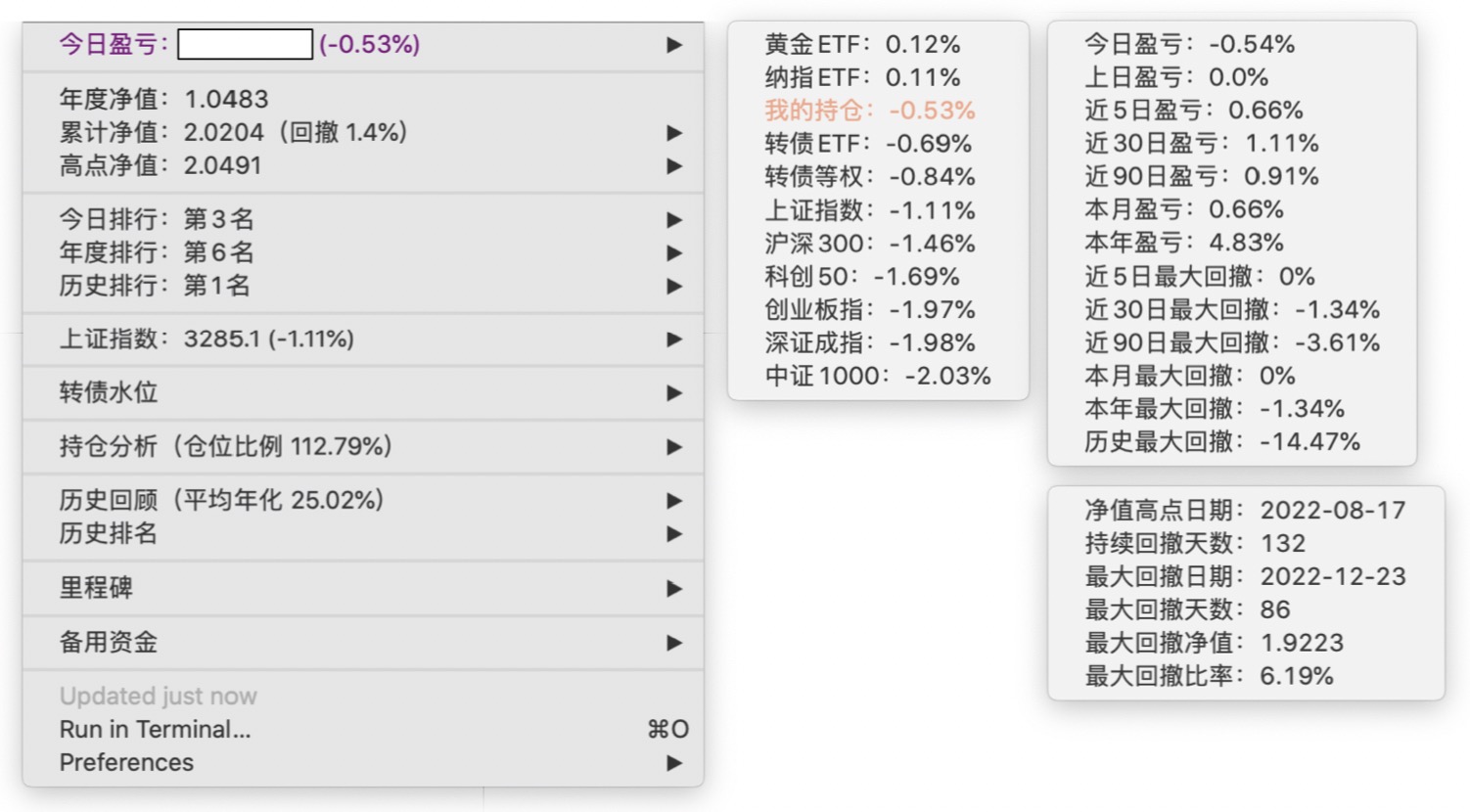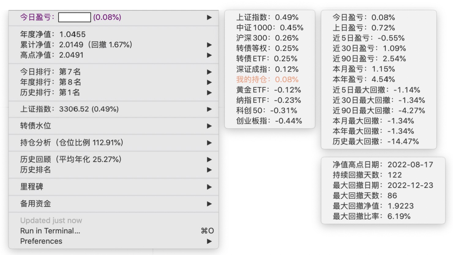 年度净值 1.0592,今日涨幅 -0.497%(排名第5),仓位 109.89%,高点回撤 -1.22%楼主这是转债市场跌了,大力补仓啊