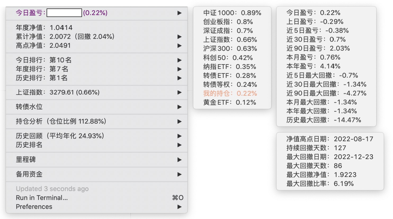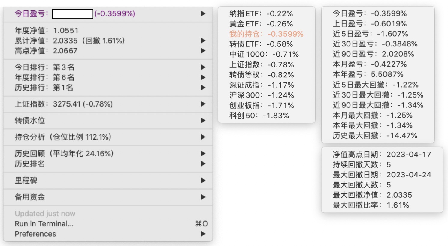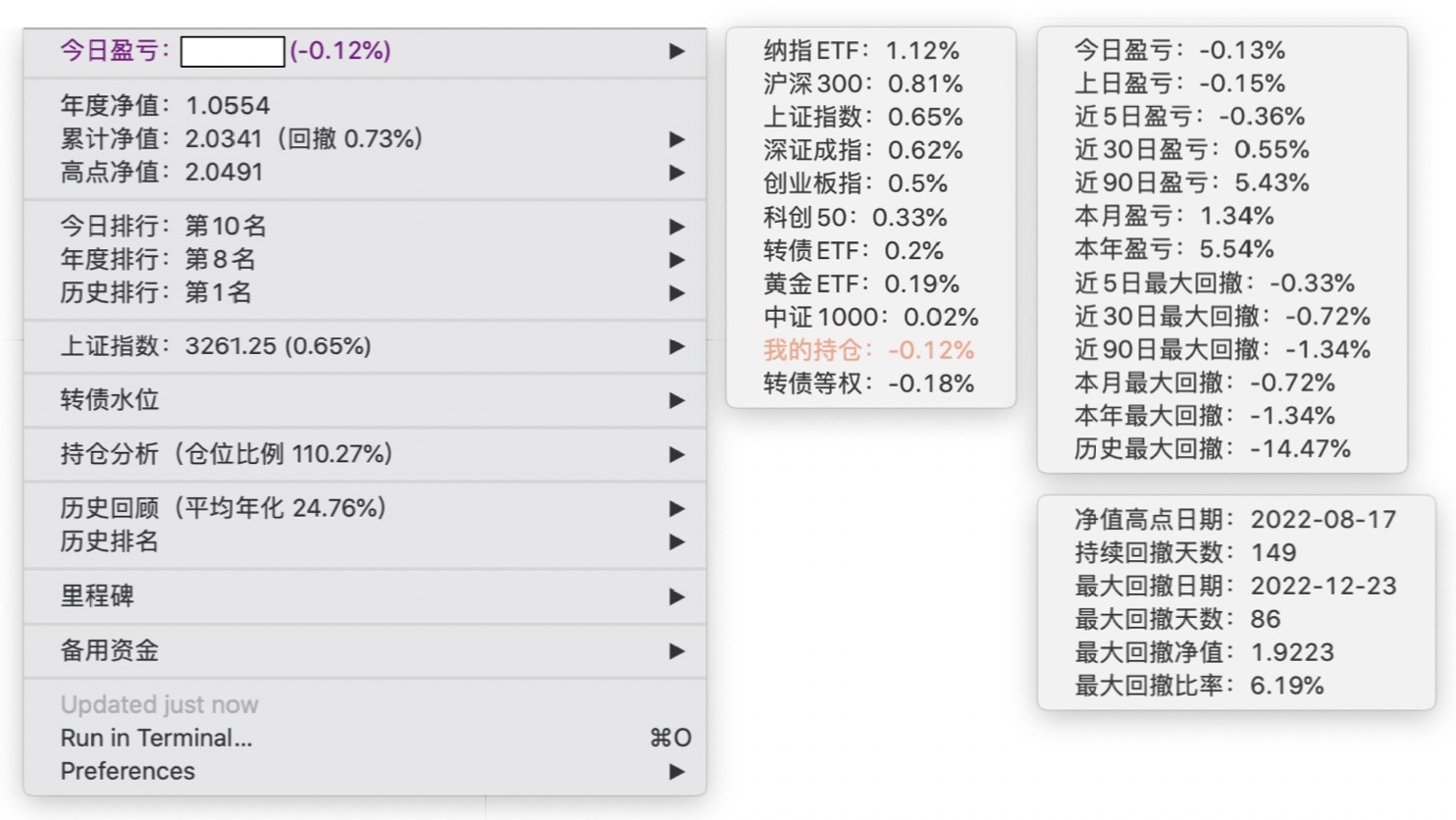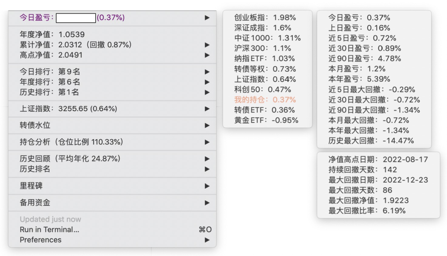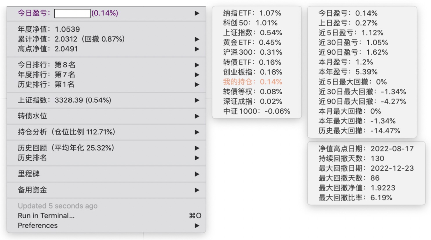 年度净值 1.0592,今日涨幅 -0.497%(排名第5),仓位 109.89%,高点回撤 -1.22%楼主这是转债市场跌了,大力补仓啊
