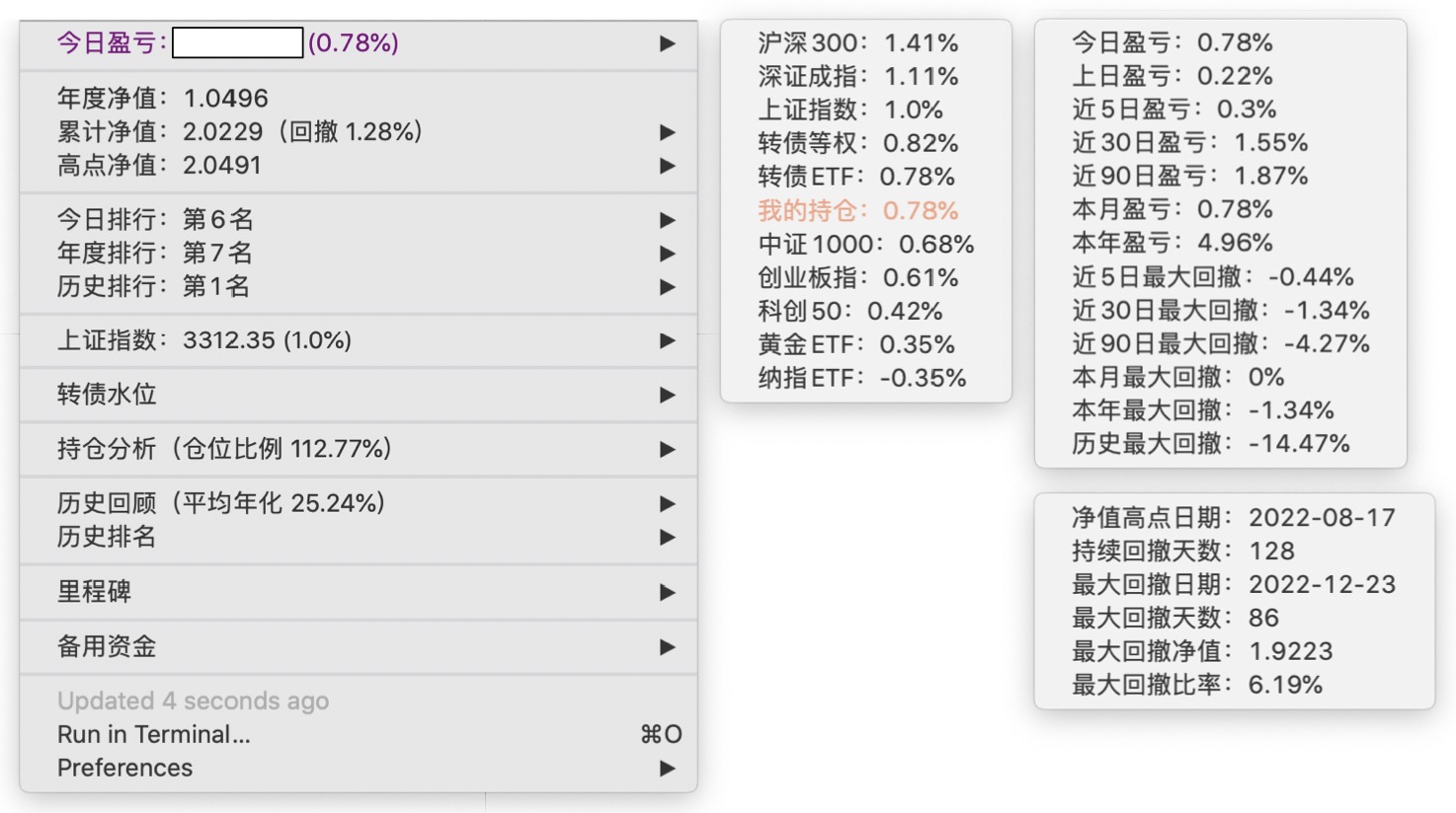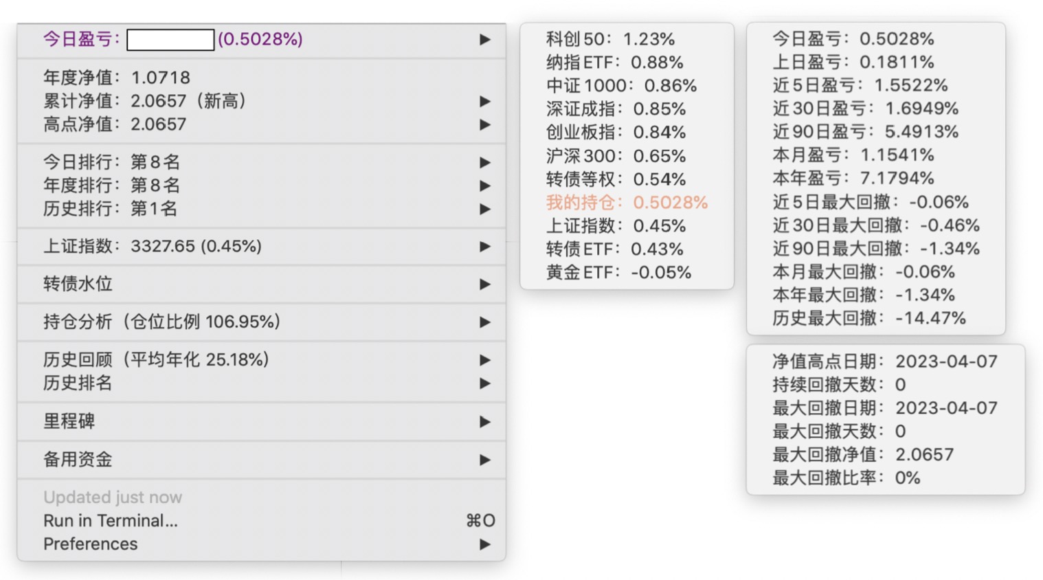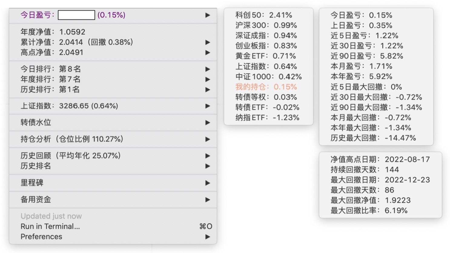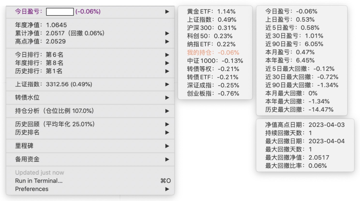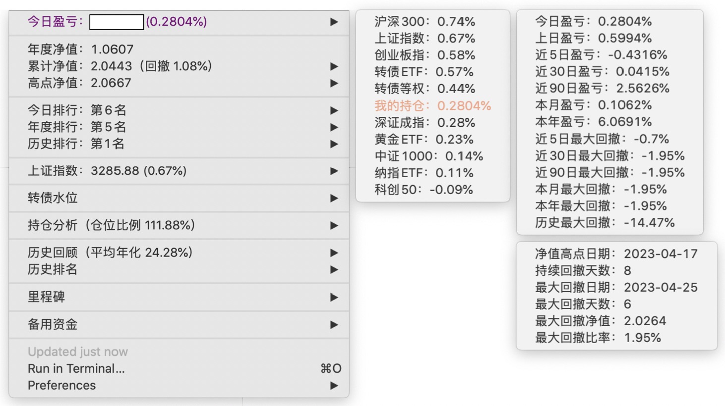 年度净值 1.0592,今日涨幅 -0.497%(排名第5),仓位 109.89%,高点回撤 -1.22%楼主这是转债市场跌了,大力补仓啊