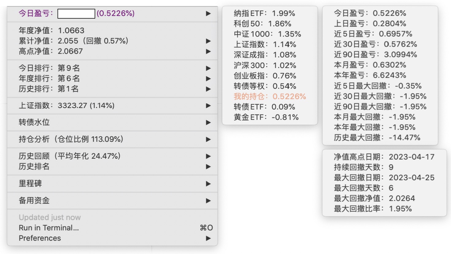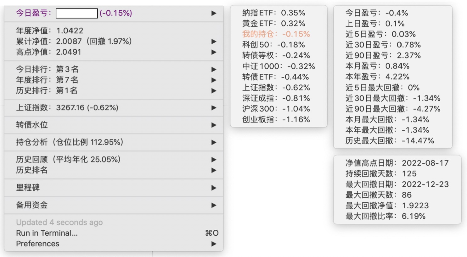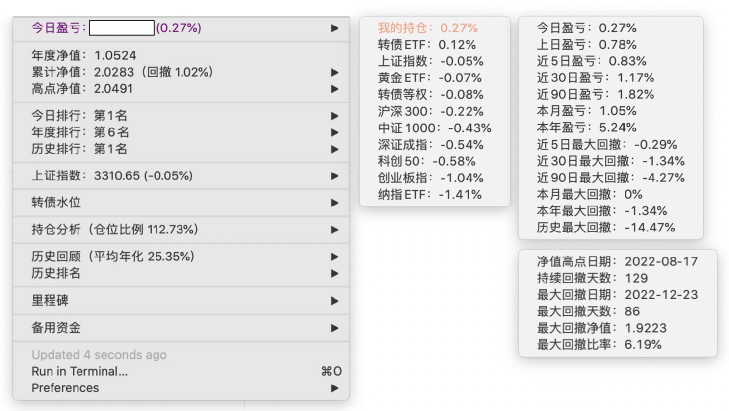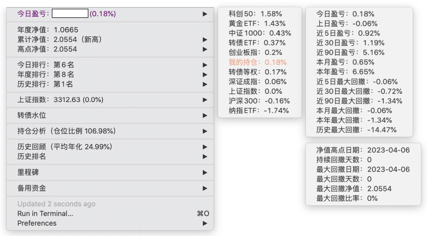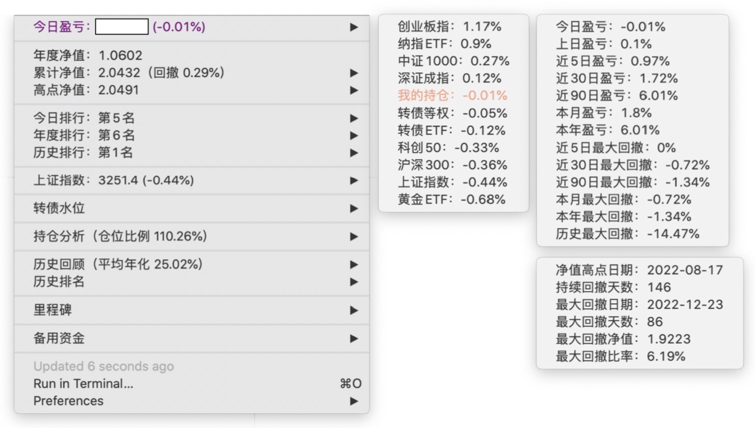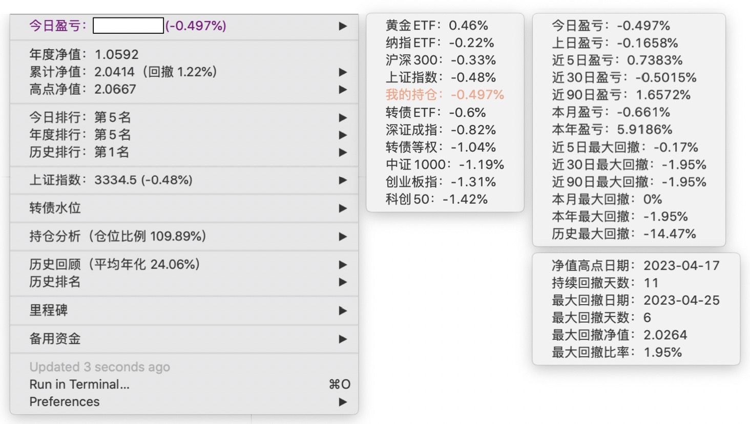年度净值 1.0592,今日涨幅 -0.497%(排名第5),仓位 109.89%,高点回撤 -1.22%楼主这是转债市场跌了,大力补仓啊