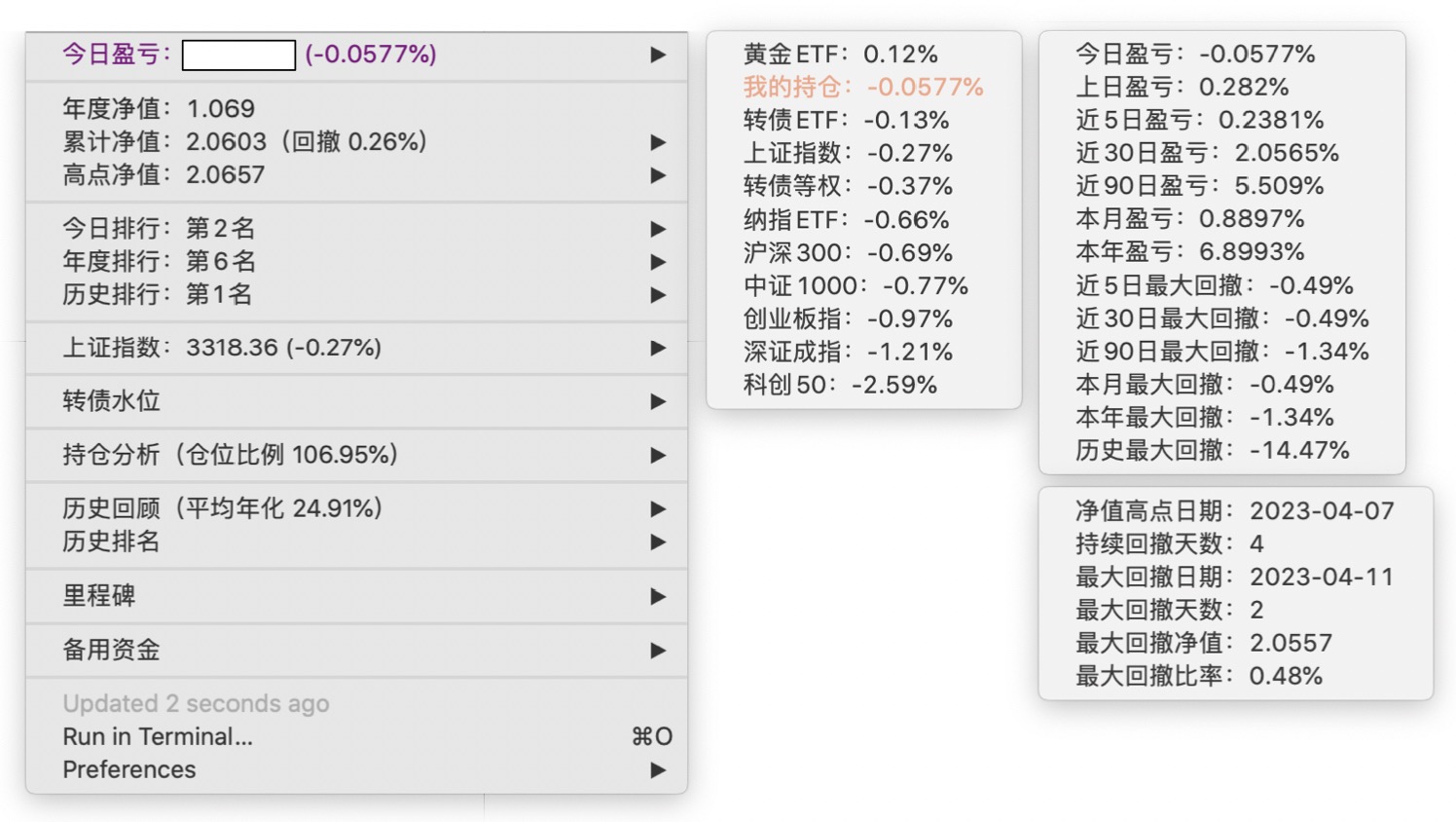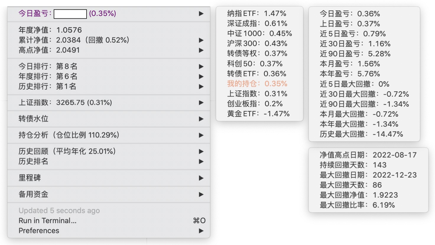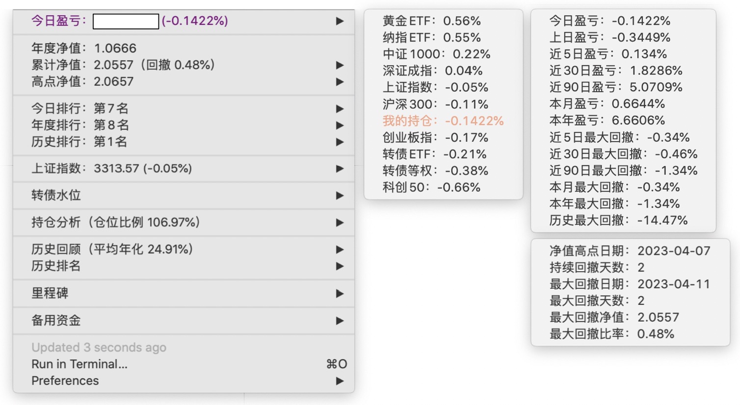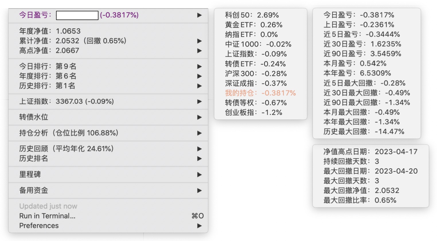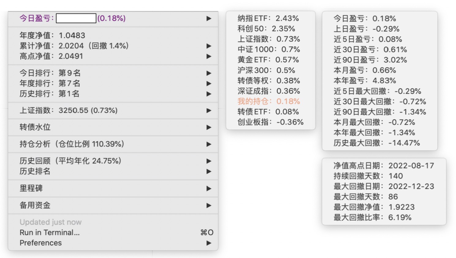 年度净值 1.0592,今日涨幅 -0.497%(排名第5),仓位 109.89%,高点回撤 -1.22%楼主这是转债市场跌了,大力补仓啊