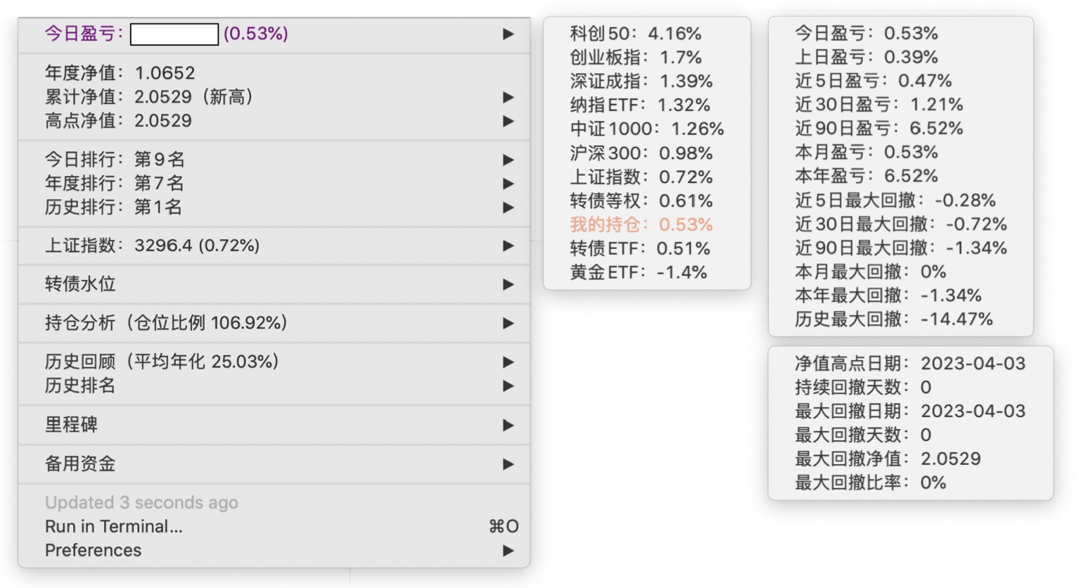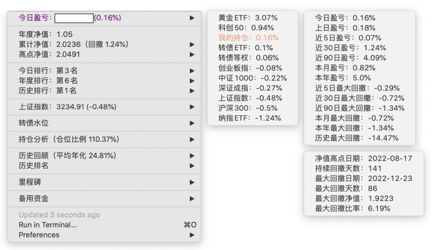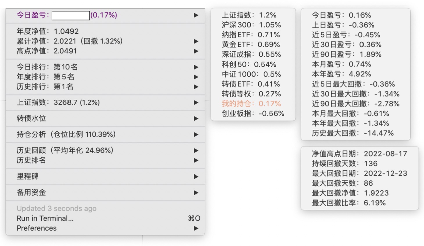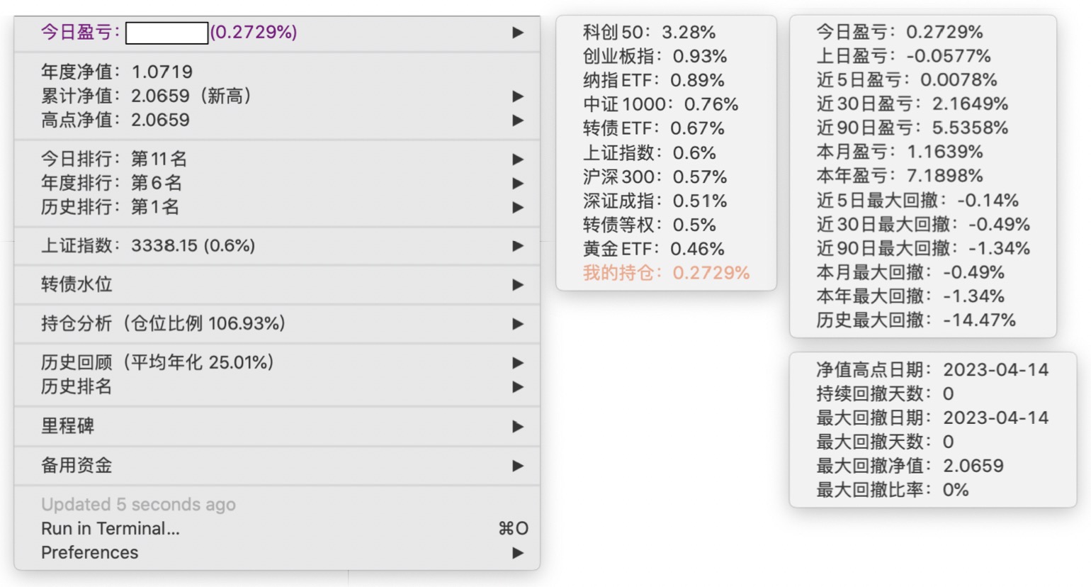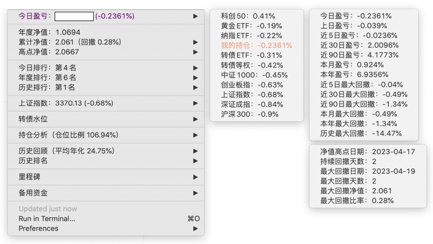 年度净值 1.0592,今日涨幅 -0.497%(排名第5),仓位 109.89%,高点回撤 -1.22%楼主这是转债市场跌了,大力补仓啊