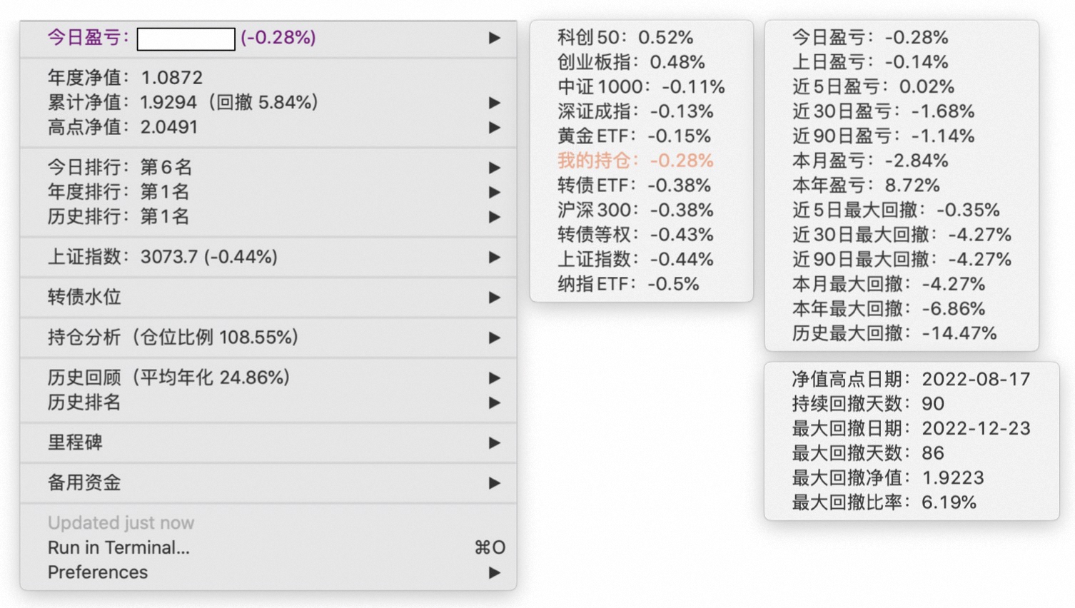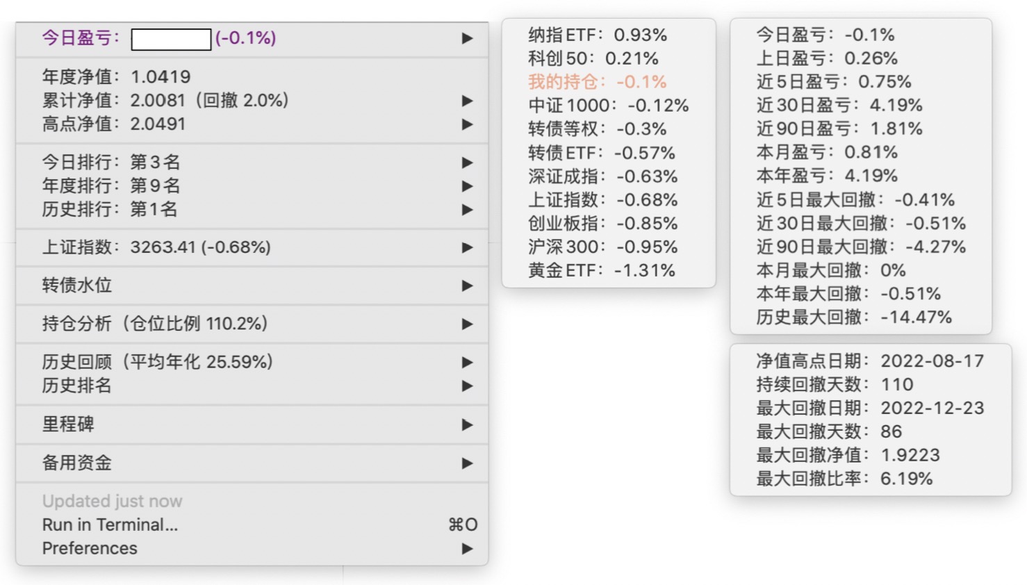 年度净值 1.0832,今日涨幅 -0.35%(排名第4),仓位 108.6%,高点回撤 -6.19%兄好,截止2022年12月23日,今年沪深300下跌了23%,兄有8%的正收益,超额收益是31%,超过了绝大多数基金经理,更重要的是这个收益的背后承担的风险很小,也是非常不错的成绩。很多人可能今年的收益看上去高一点,但是承担了很高的风险而不自知。好好休个假,2023年只会比2022年更好。