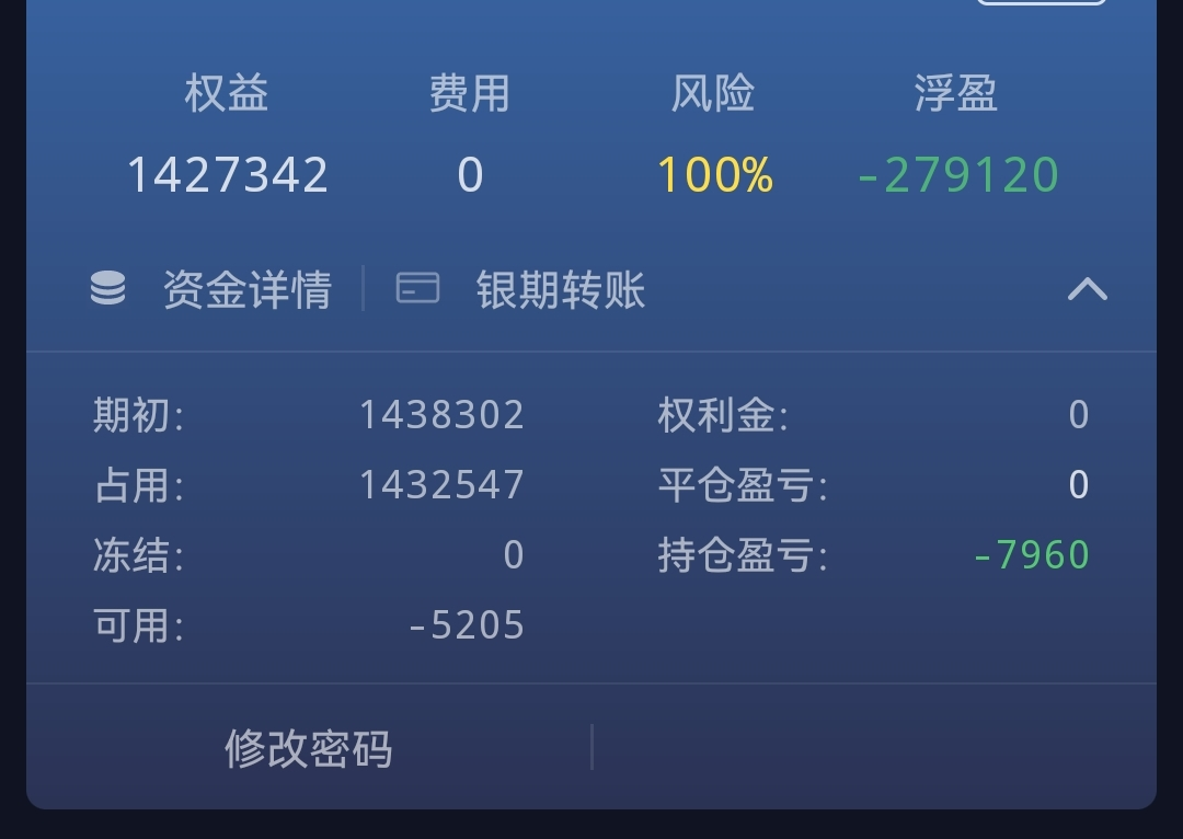 期指账户,盈利18w,加已平仓盈利53,与去年底盈利103相比,今年期指亏损32w。同备用资金存款利息差不多了。