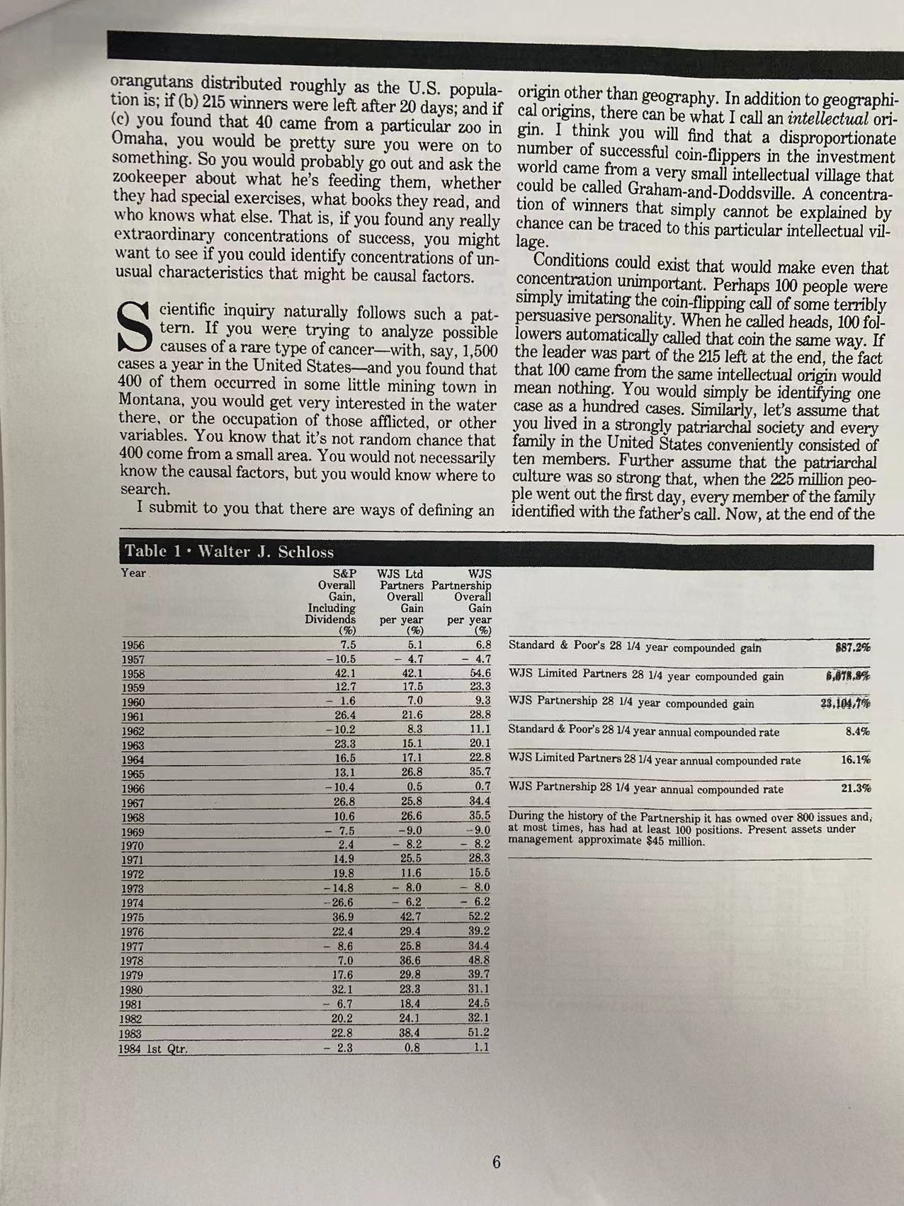 早就耳闻大师兄沃尔特•施洛斯,于是搜寻他的资料。施洛斯没有写过任何书籍和文章,前期在投资界是一个隐者似的存在,几乎没有人知道他,他也不跟外界联系,就是一个人,在证券公司的衣帽间放张桌子,房间连窗户都没有。直到巴菲特在1984年发表文章纪念格雷厄姆的《证券分析》出版50周年,举例9个超级投资者采用格雷厄姆的原则投资取得优异成绩,第一个就是施洛斯。施洛斯才在投资界为人所知。可以说,从格雷厄姆到施洛斯,都是因为有这么一个股神巴菲特,才变得有名或者名气更大。