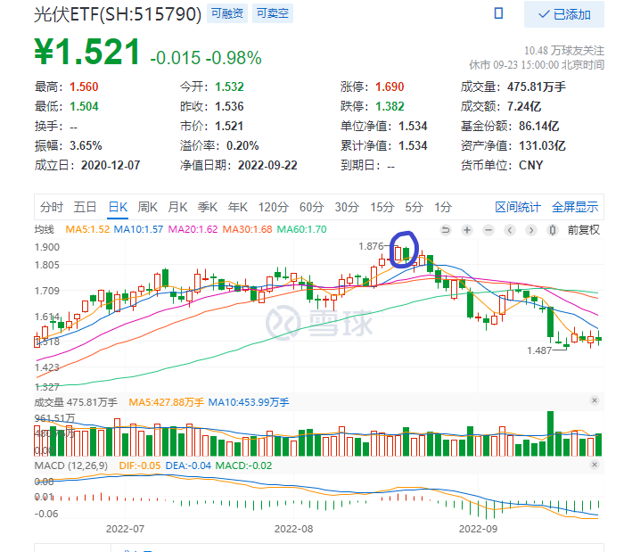 主贴发布时间2022年8月19日,光伏ETF(515790)收盘价1.821,当天最高价1.873