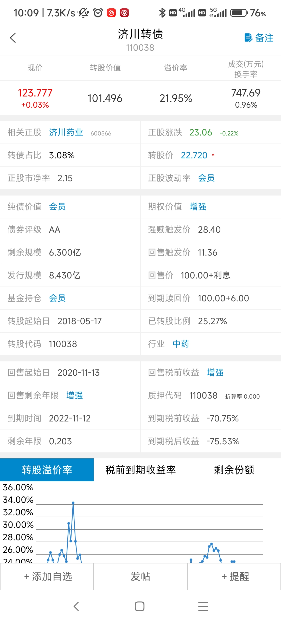 最终溢价率会收敛。可能性1:转债价格下跌至106附近。然后部分折价或者溢价转股,部分到期赎回。可能性2:正股上涨,强赎,可能性较低。可能性3:正股上涨,转股价值维持在106以上,折价转股。综上,目前持有济川转债不是好的策略,当转债价格跌至106-108,有一定的博弈价值。或者直接买入正股,短期博弈,也是可以的。个人观点,仅供参考!要是转债能做空就好了*