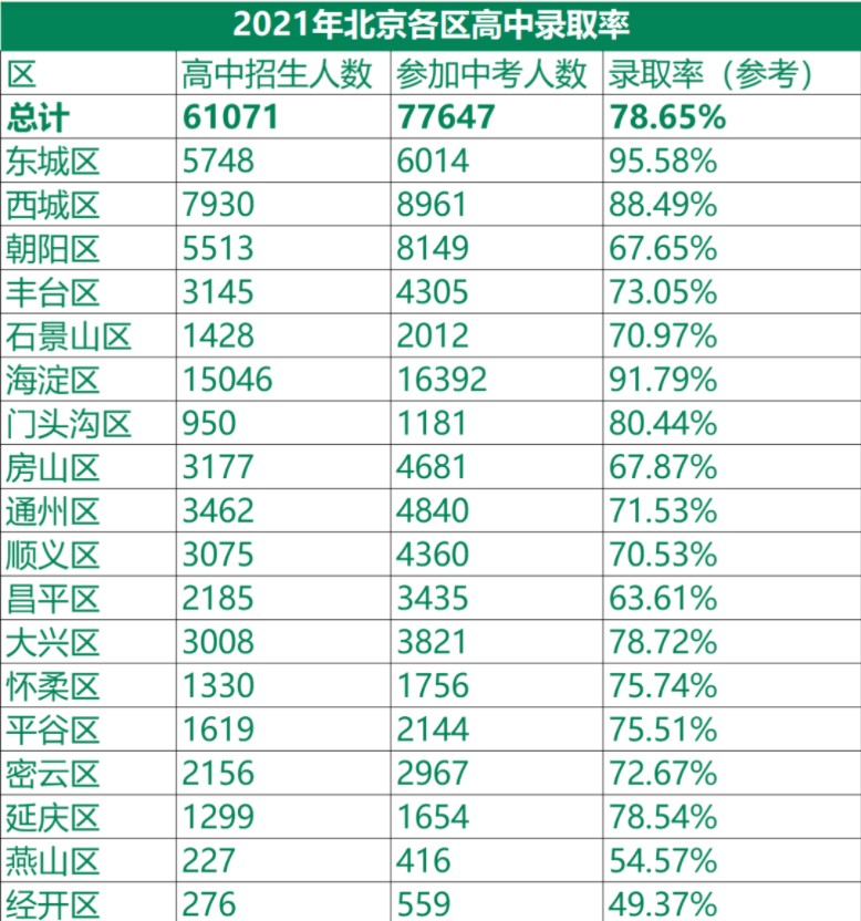 看看北京的均值,再看看三个远高于均值的区,家住东城,西城,海淀就基本保证孩子有高中上了