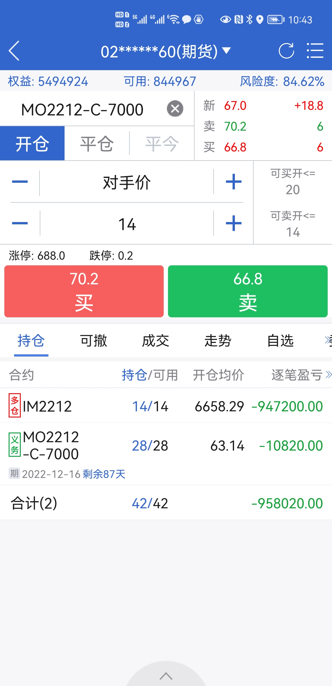 现在600万保证金,卖了28手MO12月份的7000认购期权,感觉后面行情不太好,IM年底很难超过7000点,所以卖点期权金弥补一下换月的弱智操作损失。如果超过7000点怎么办,那就按照7000结算呗,几个月赚一百多万,也可以了