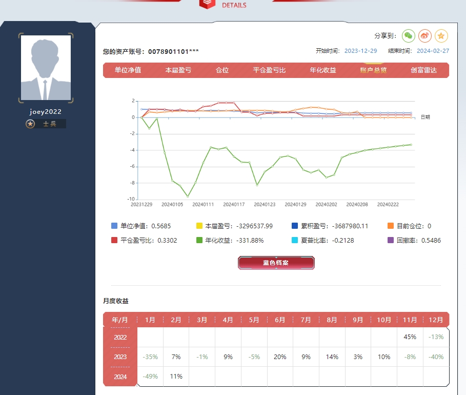 楼主似乎是类似震荡的策略,每年底年初出大波动时会亏损,目前似乎推出了。
