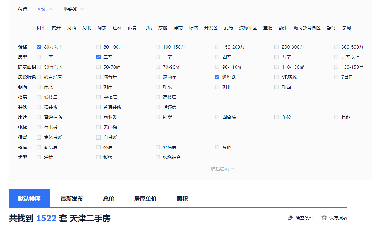 天津市现在贝壳上总价80万以下的二室近地铁房源共有1522套。当然如果按照最新发布排列,天津市的均价还是在2-3万左右。这种低价房大概率是没有电梯的老破小的顶楼吧?这种房子真成鸡肋了,涨不动也卖不上价