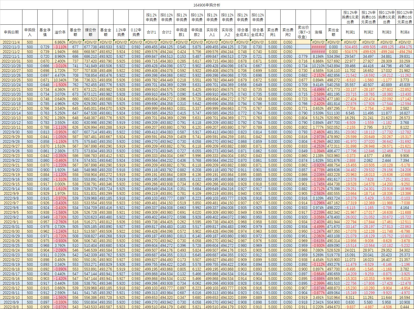 164906的500元申购操作,随着11月4日大涨,基本可以盖棺定论。无论是开拖拉机还是复兴号,只开1户还是开6+1户,赚的都是抄底的钱。