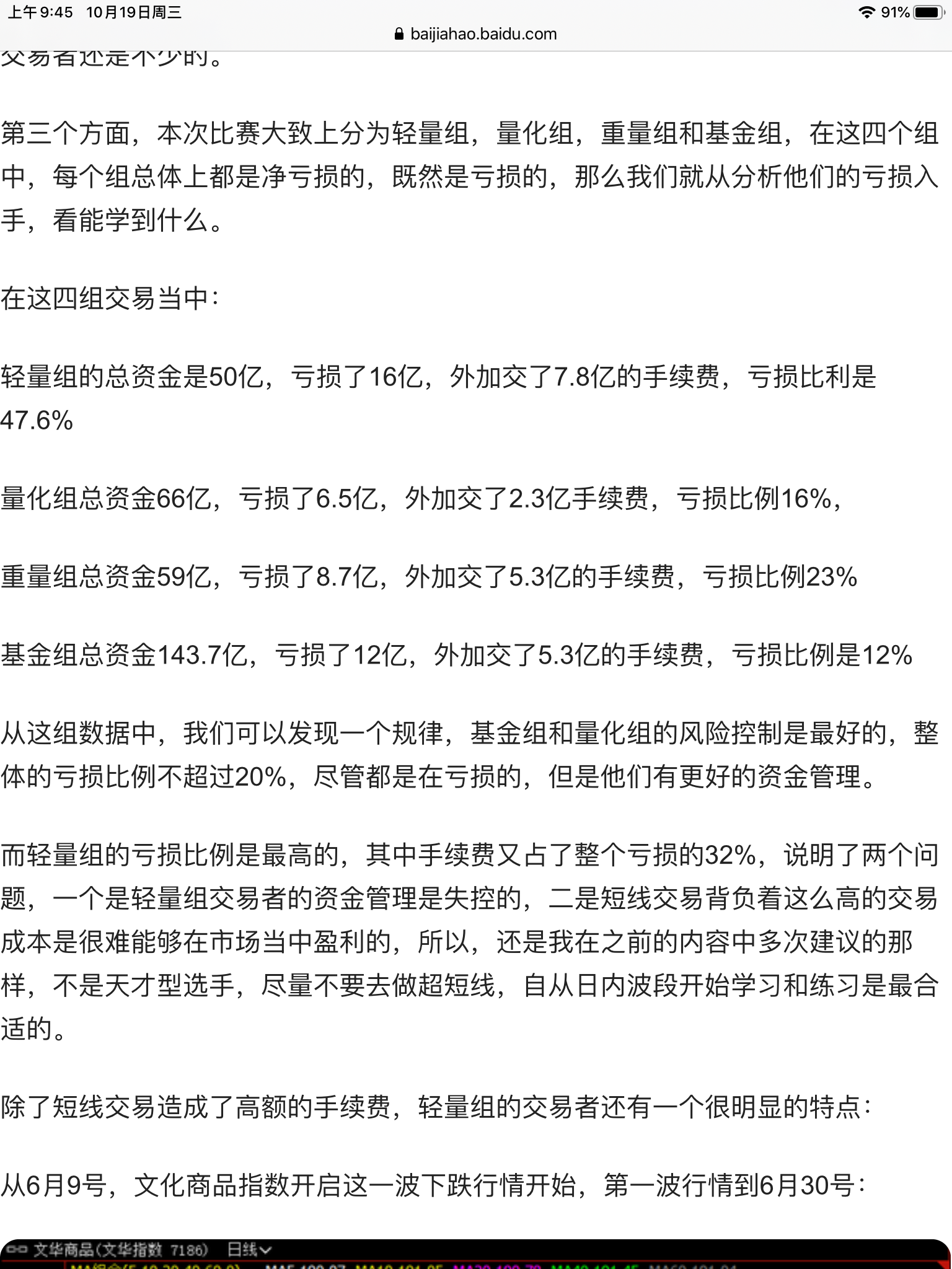 也有人联系过我,不过以我的仓位控制,肯定不会排在前边。所以虽说报名没费用,但也没意义,还可能动作变形,所以我也没参加过。这个比赛,其实还是自己在自己账户正常交易的,只不过报了名,在比赛期间统计损益。所以理论上,一般报名者不额外多交费用,除非自己太当回事,比平时更活跃交易。无论如何,报名的人都是自我感觉良好,或者抱着无所谓心态参加的,但是大多数年份,这个比赛的参与者损益和为负。今年亏损和又创纪录。...从单笔交易盈利一百到一千,到两千,到更高。