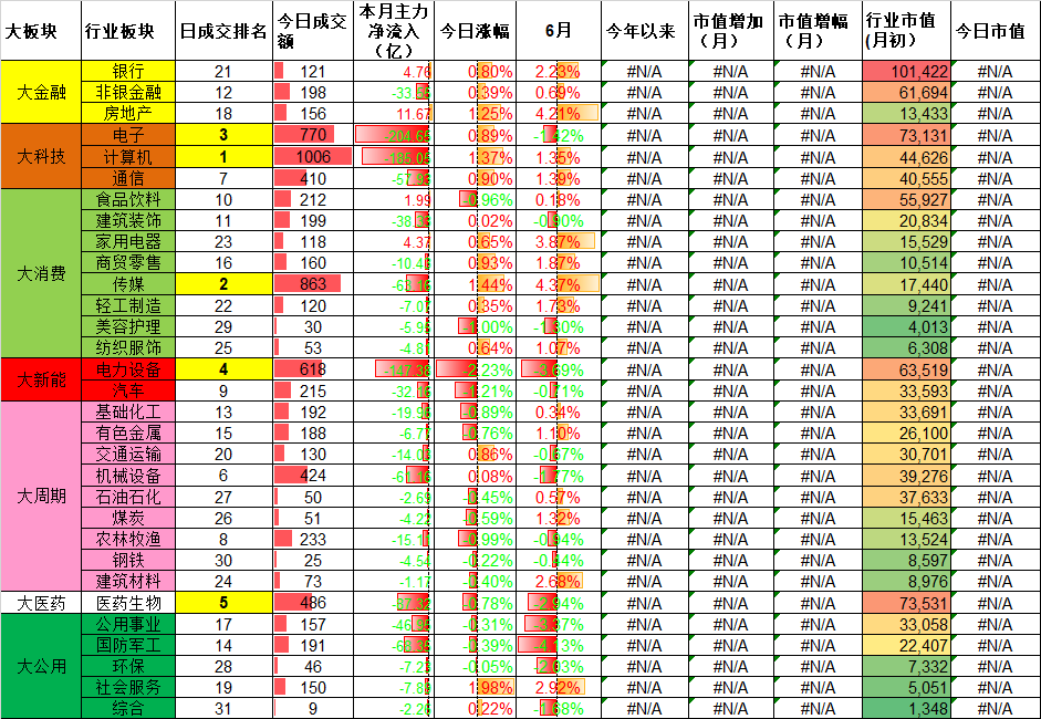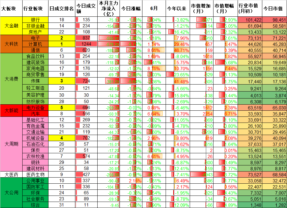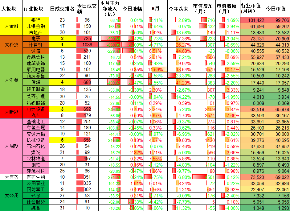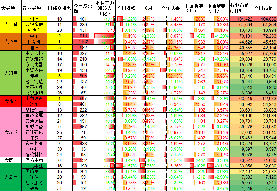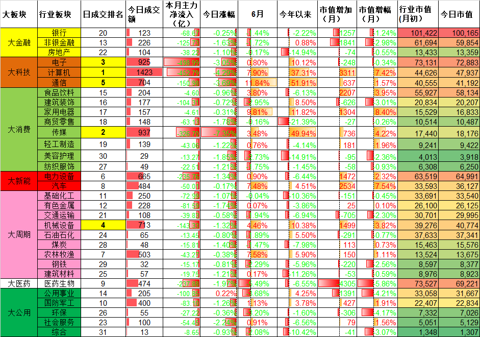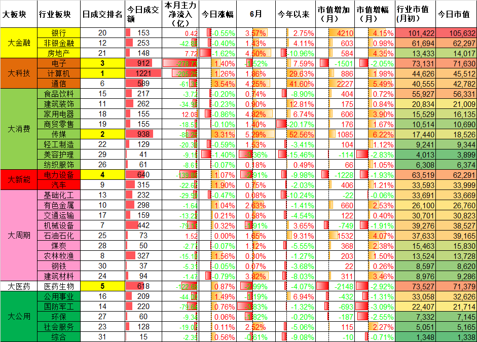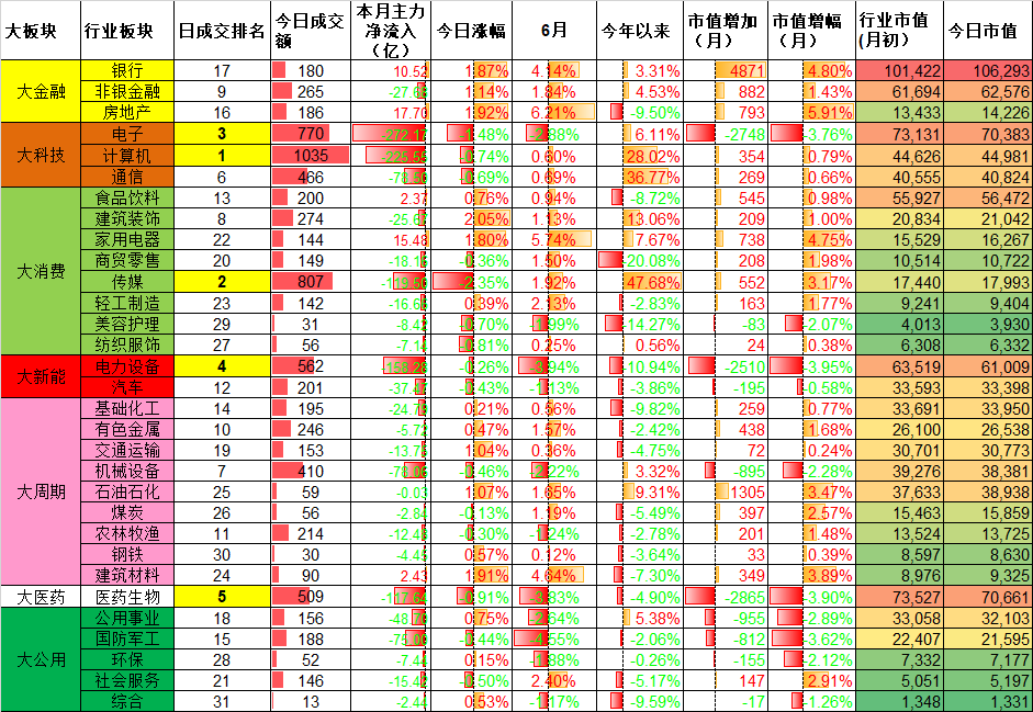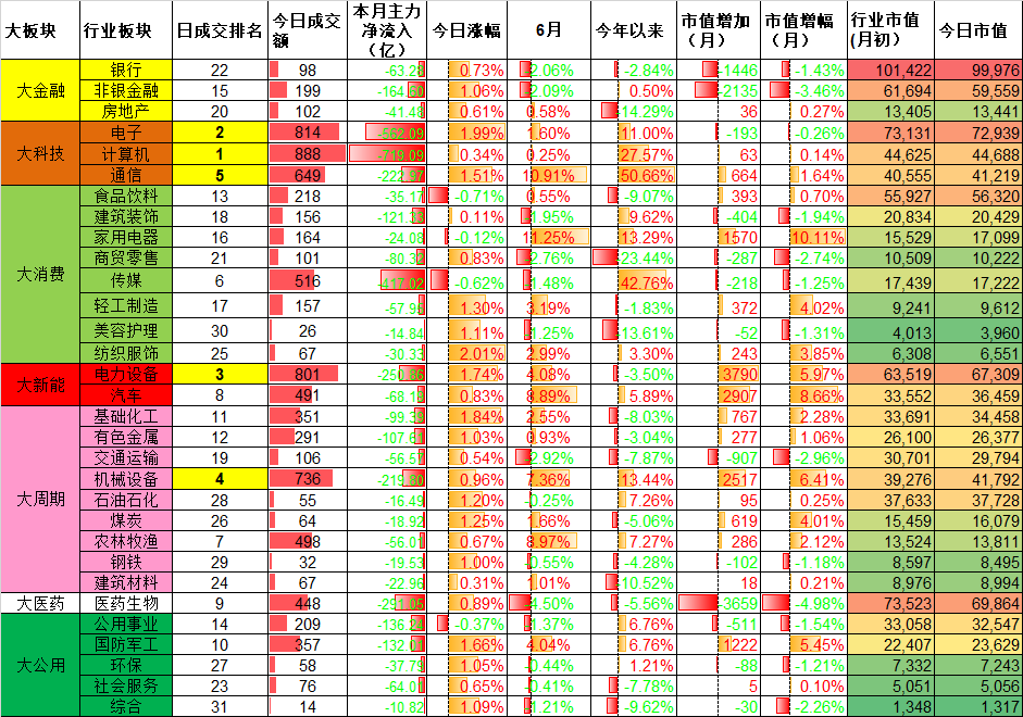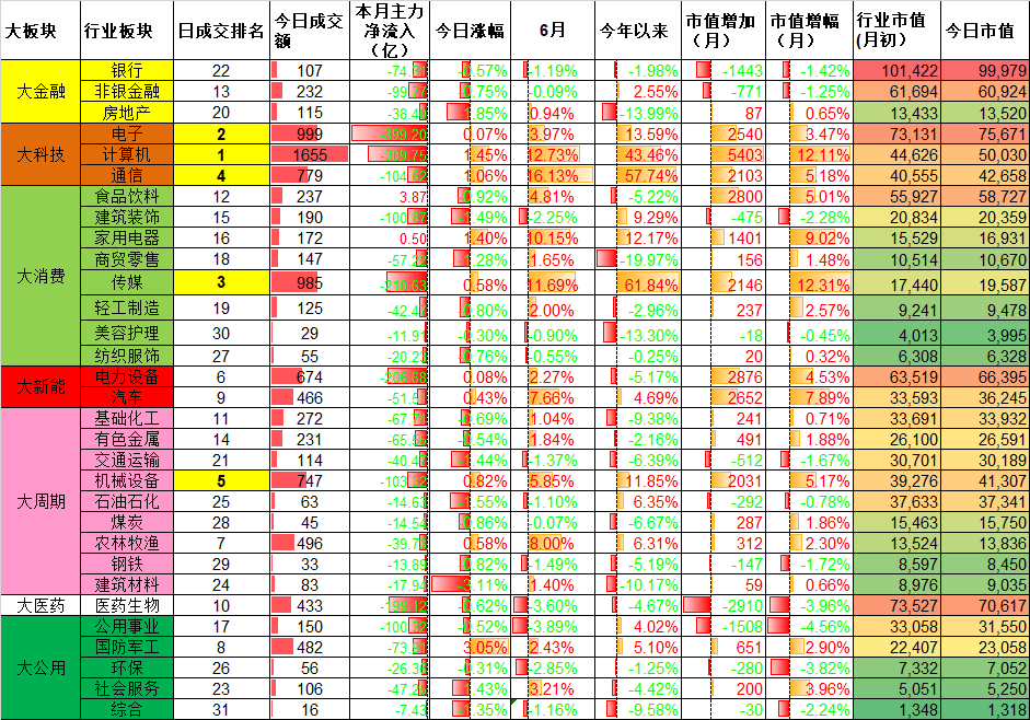 6月份已经能看出 每天的成交额有其他板块挤进来了,心里还是倾向于主流+非主流共振,或者非主流板块变成主流板块。单纯押注主流板块(计算机 传媒 信息)继续领涨风险大。