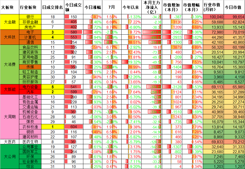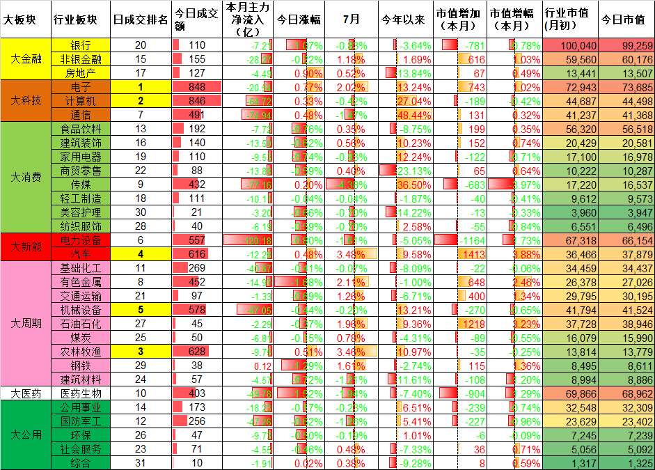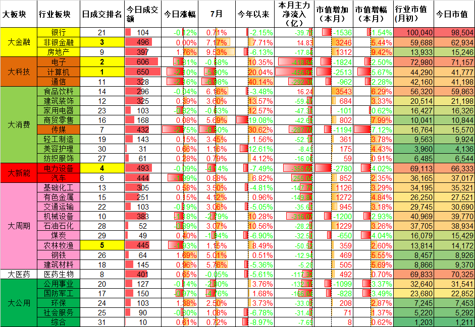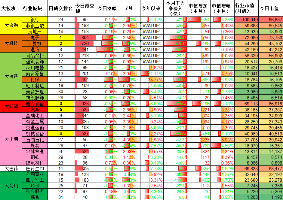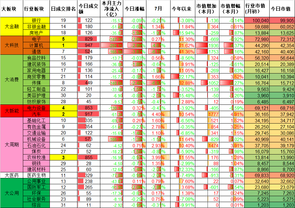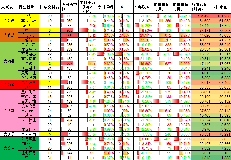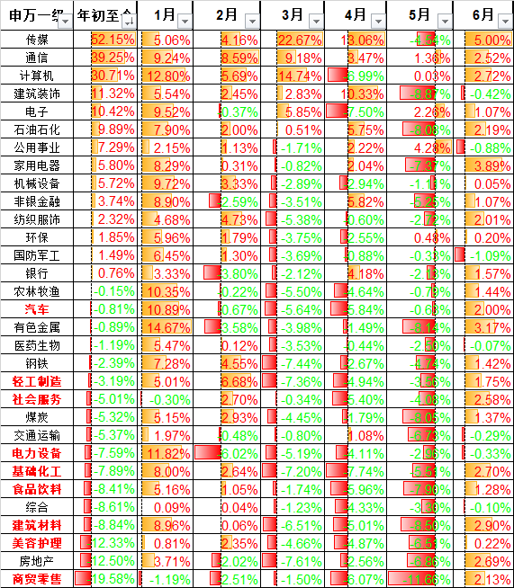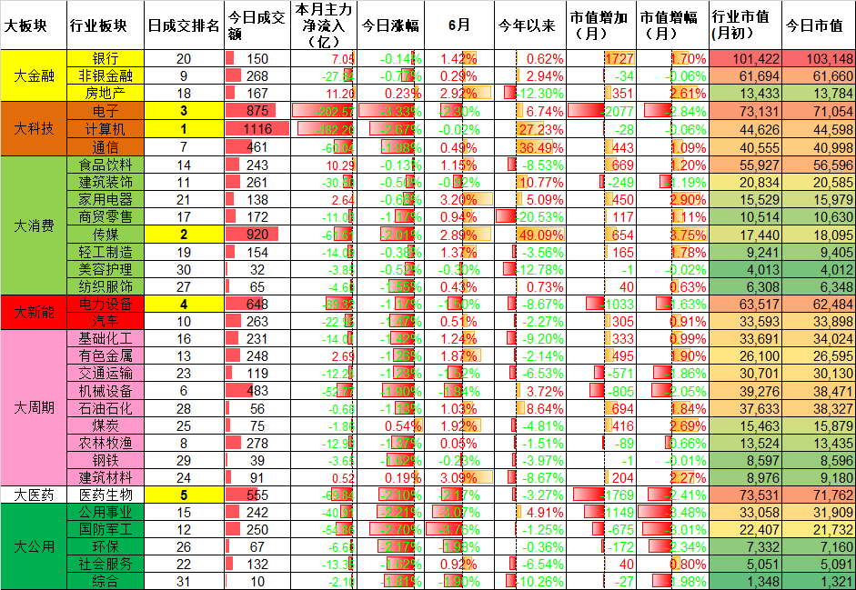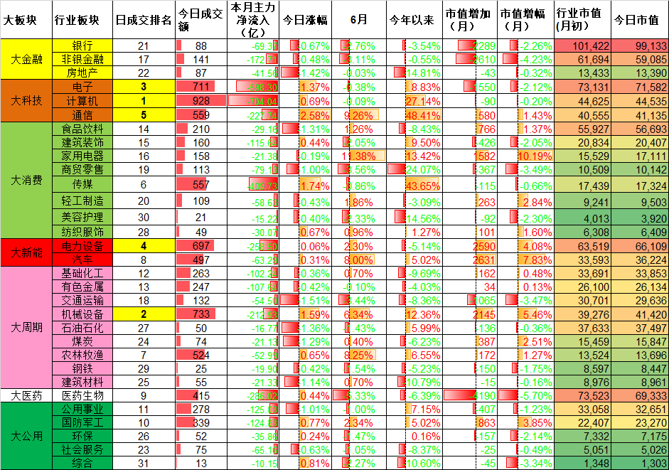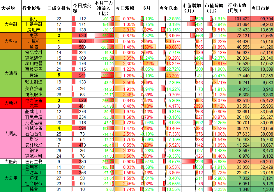 6月份已经能看出 每天的成交额有其他板块挤进来了,心里还是倾向于主流+非主流共振,或者非主流板块变成主流板块。单纯押注主流板块(计算机 传媒 信息)继续领涨风险大。