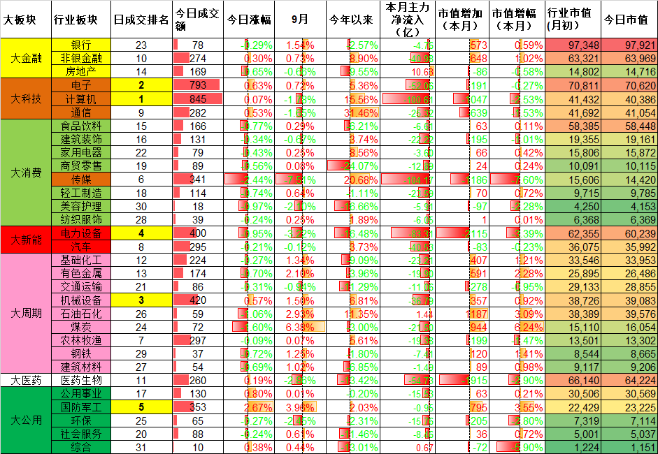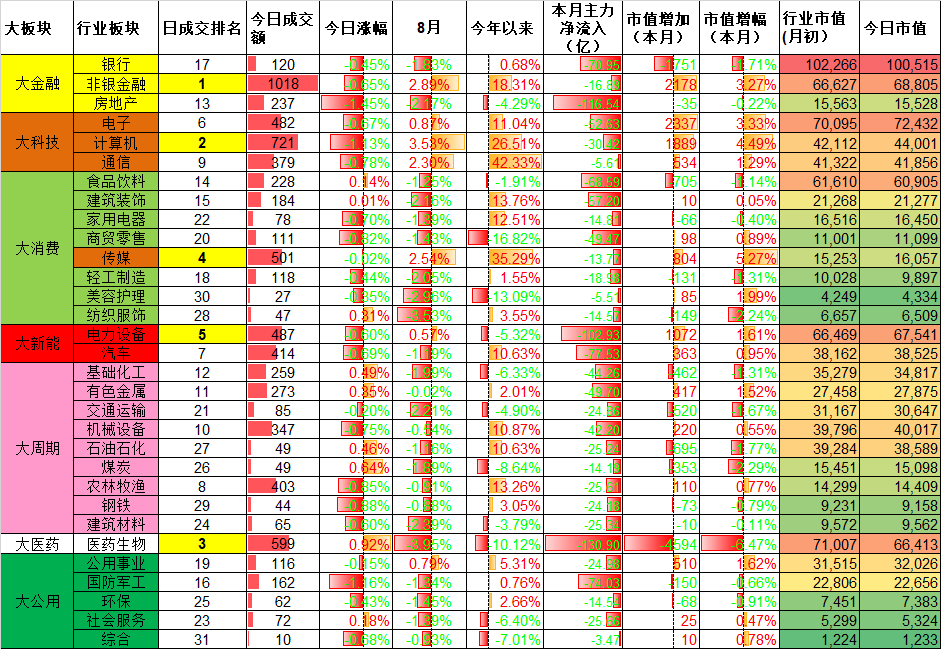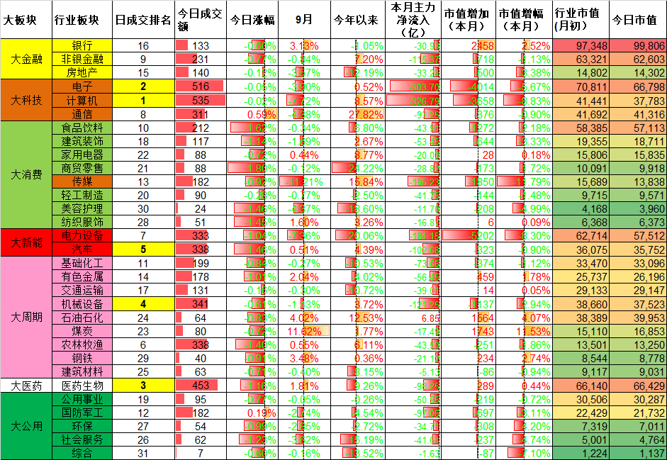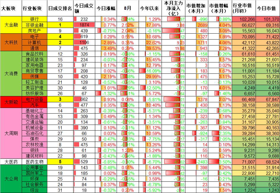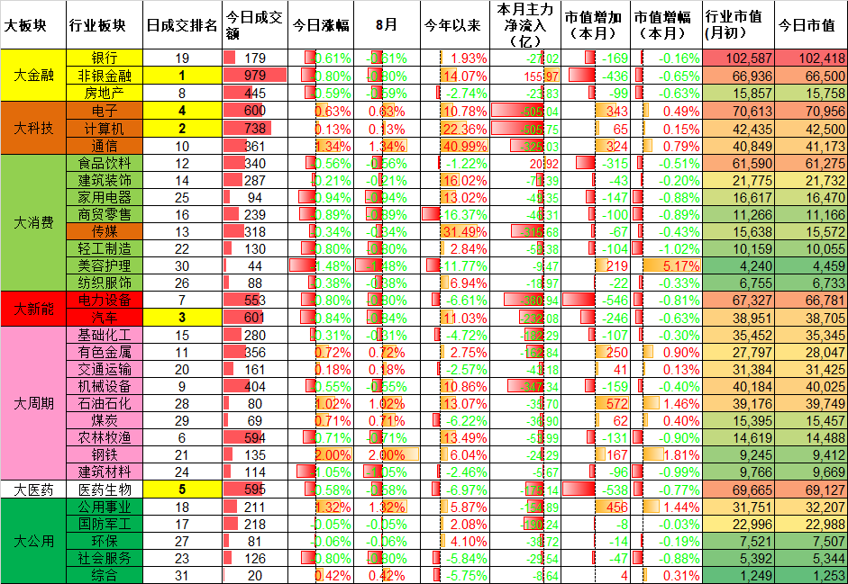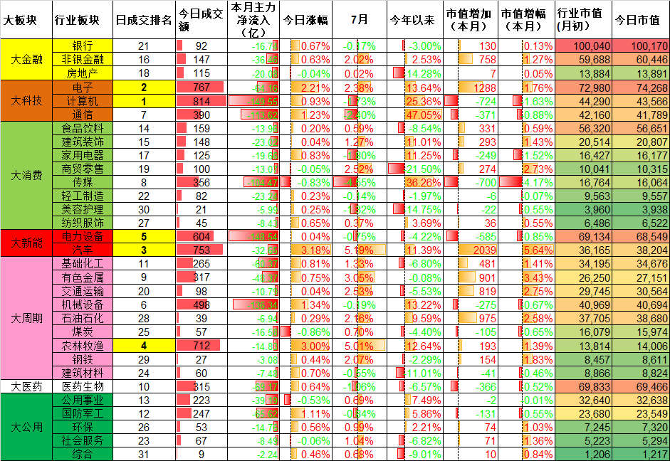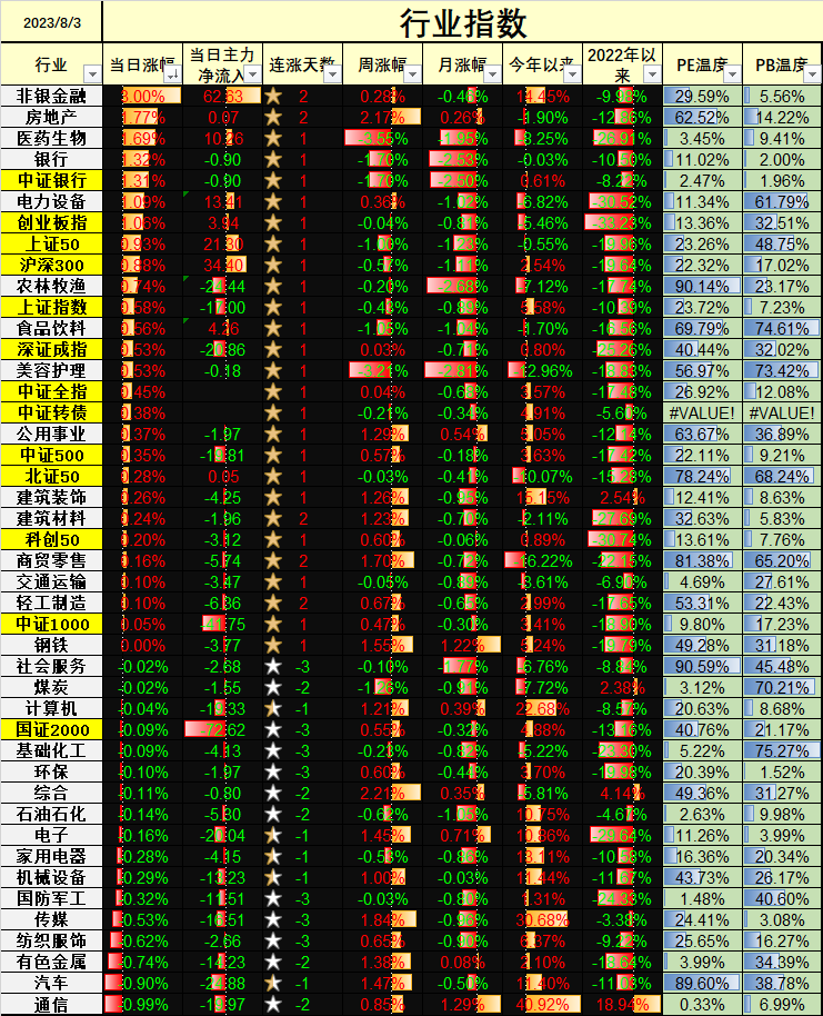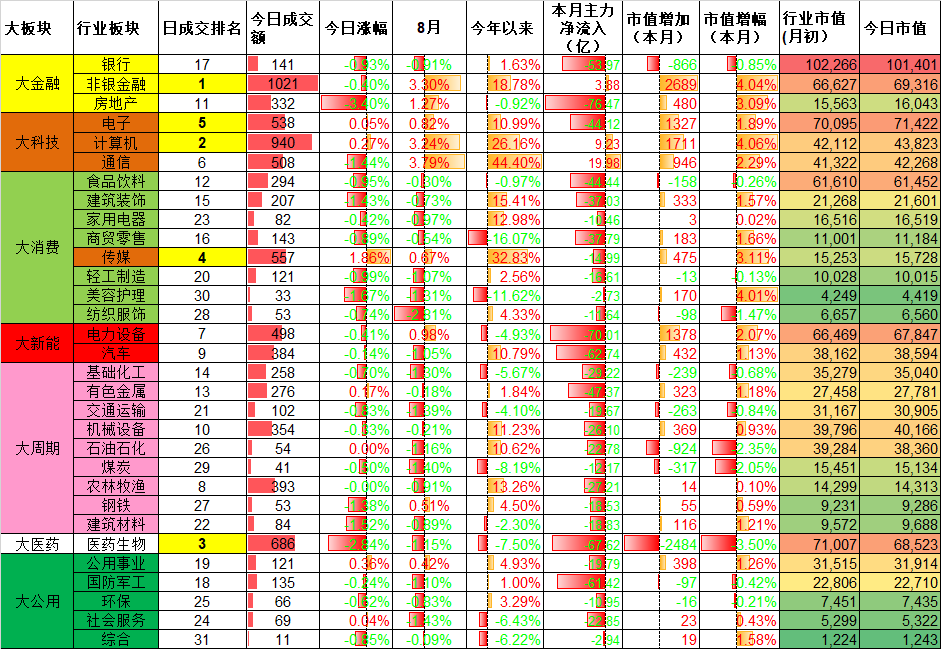 板块方面:非银金融+3.00%、房地产+1.77%、医药生物+1.69%领涨;