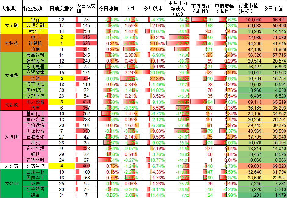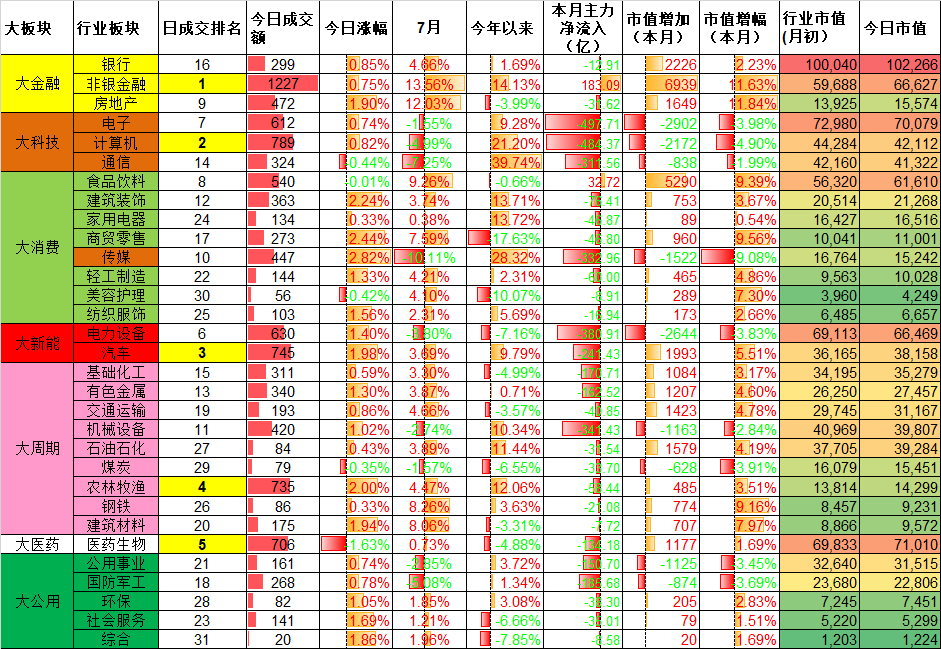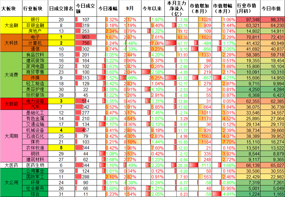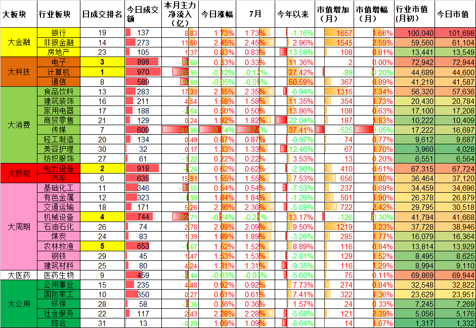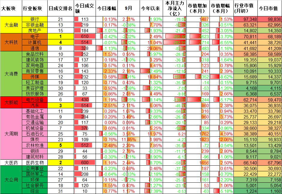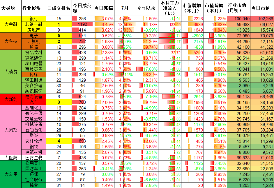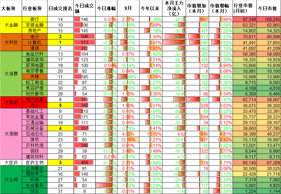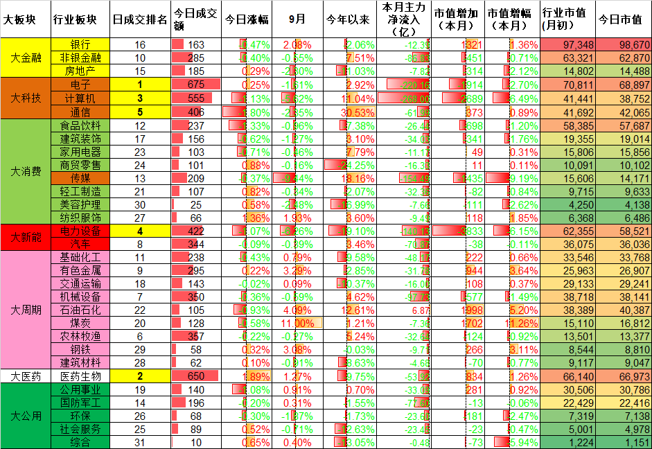 板块方面:非银金融+3.00%、房地产+1.77%、医药生物+1.69%领涨;
