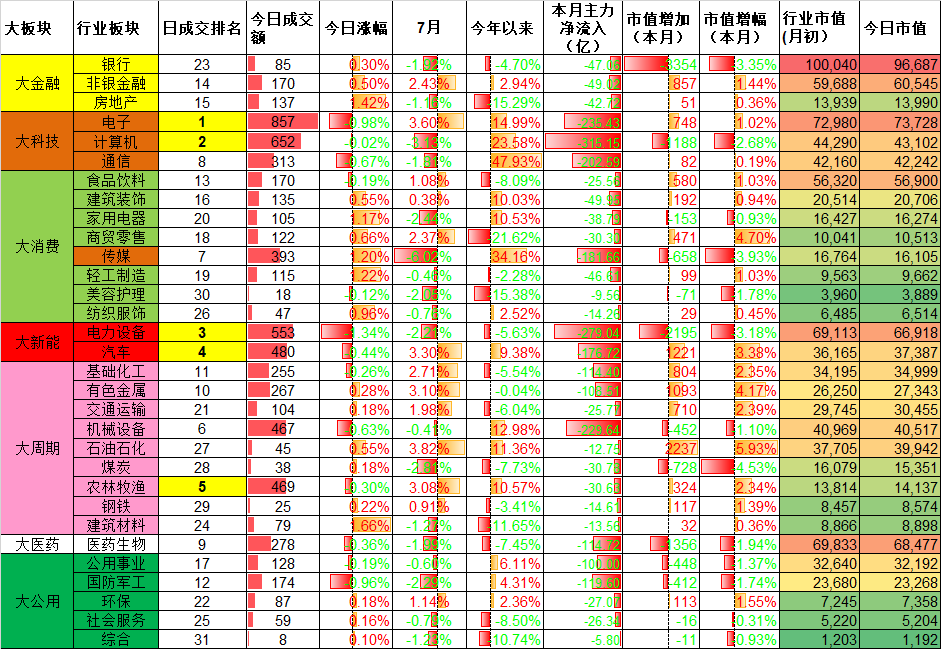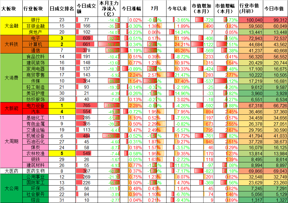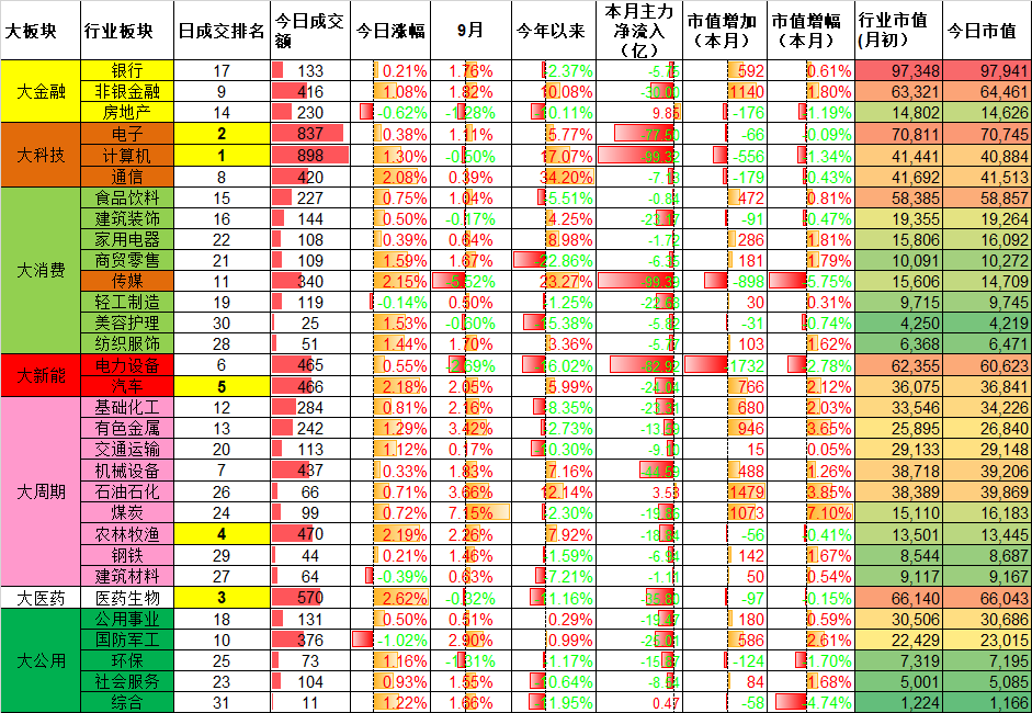 板块方面:公用事业+0.70%、煤炭+0.53%、电力设备+0.22%领涨;