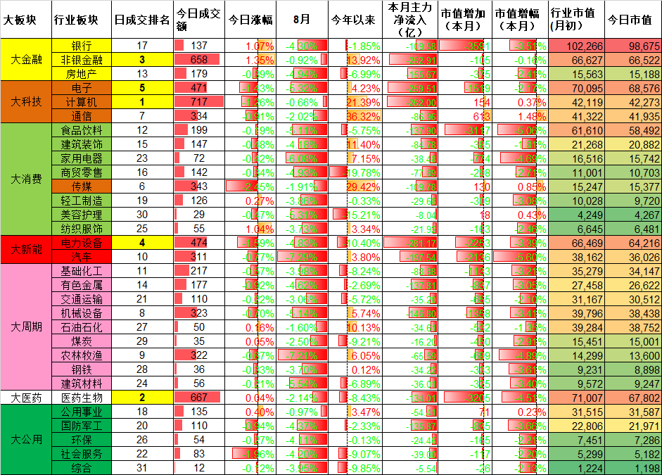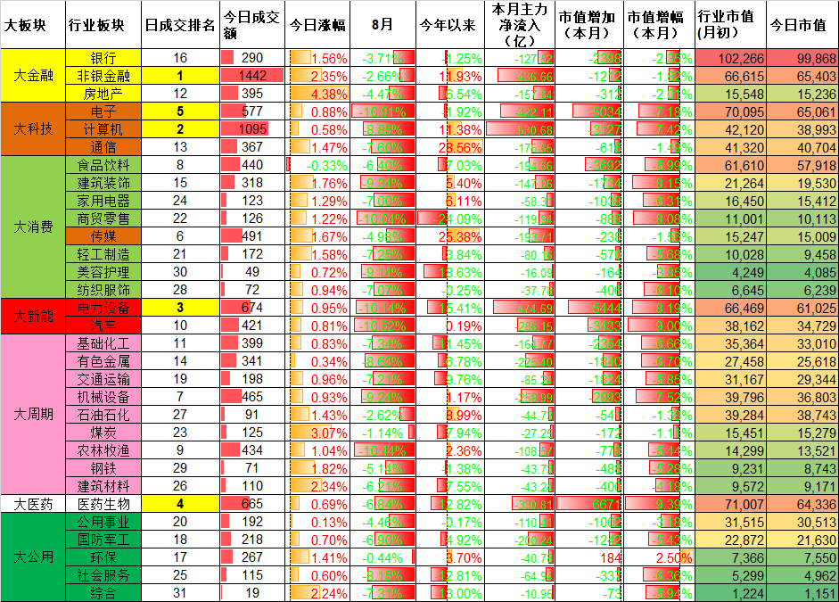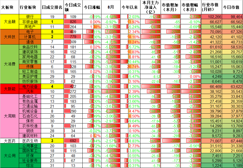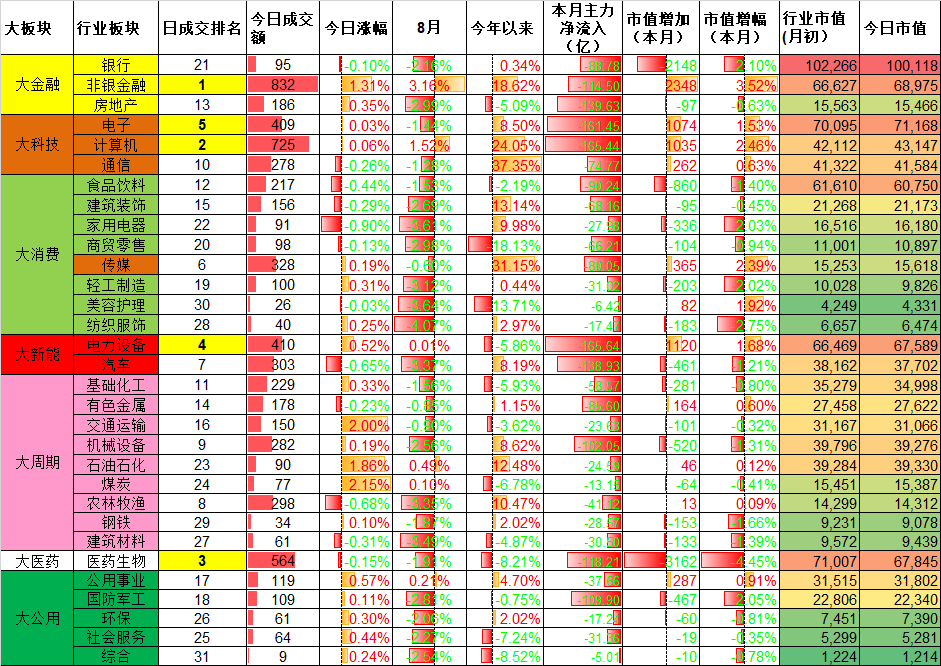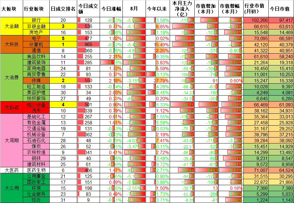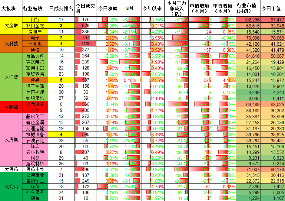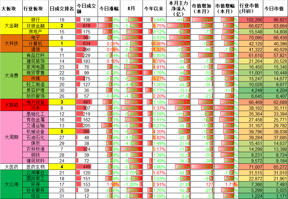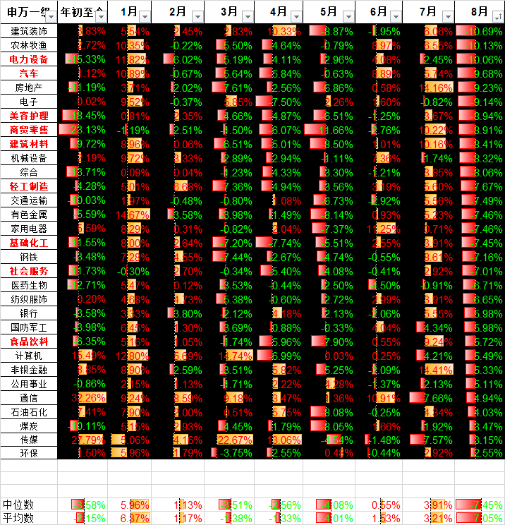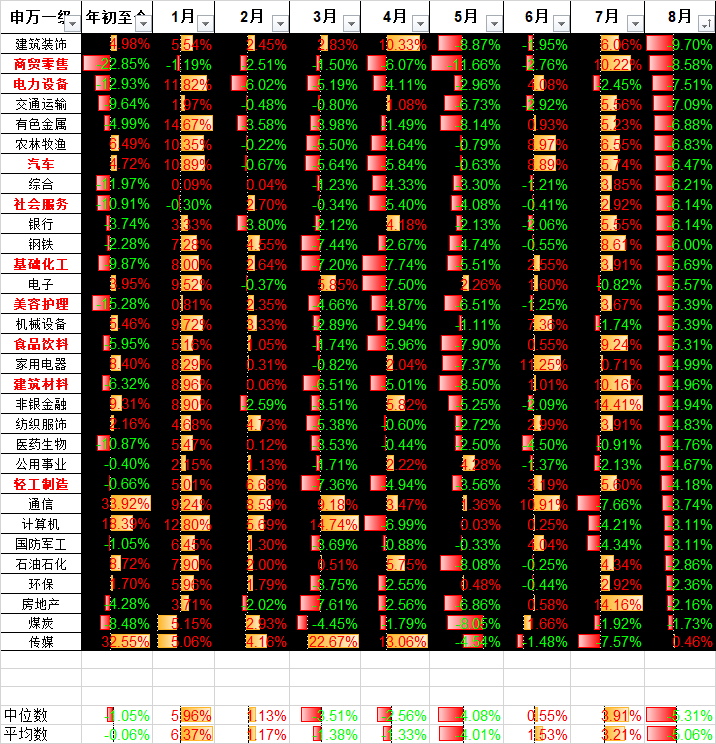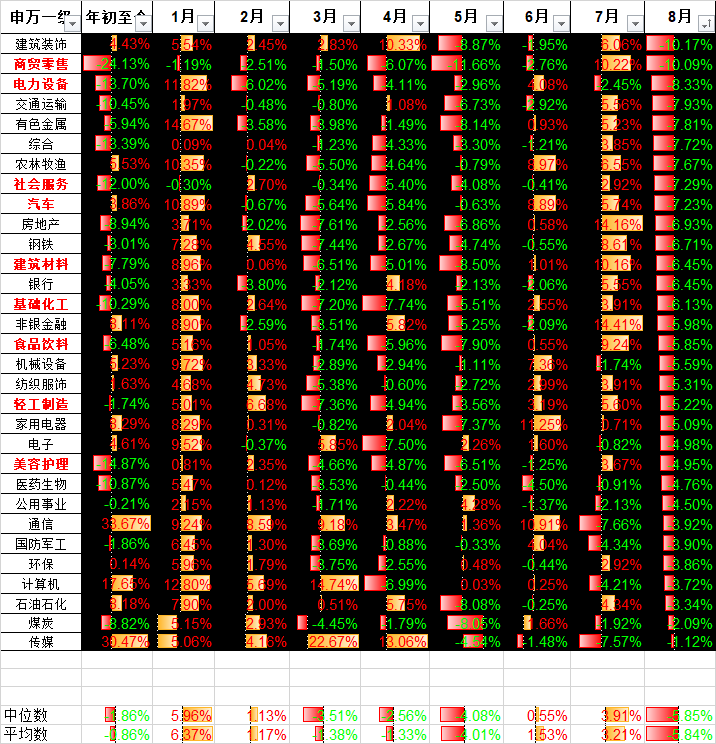 北向资金在连续净流出13天后,今天终于净买入了,是反弹还是反转拭目以待。核心还是观察汇率能否稳住。8月以来,各个板块跌的不少,中位数跌幅是本年最高的一个月。市场很少无脑单边涨或者单边跌,真单边涨跌就是牛熊了。