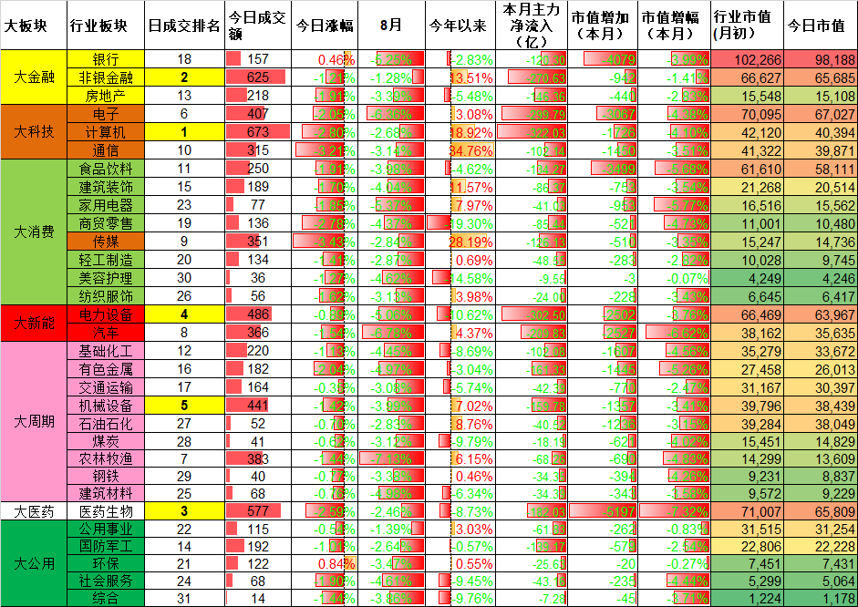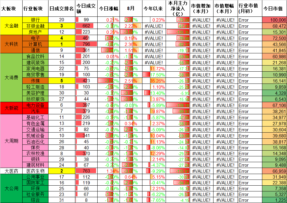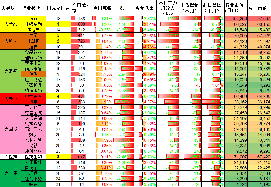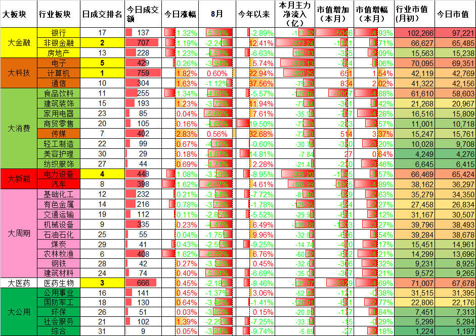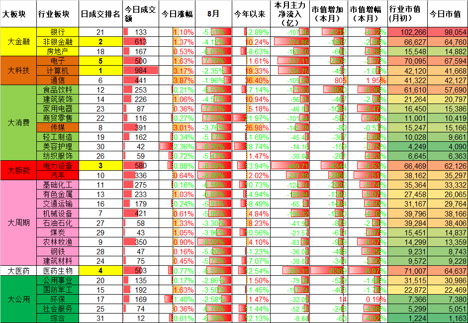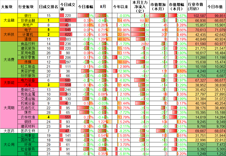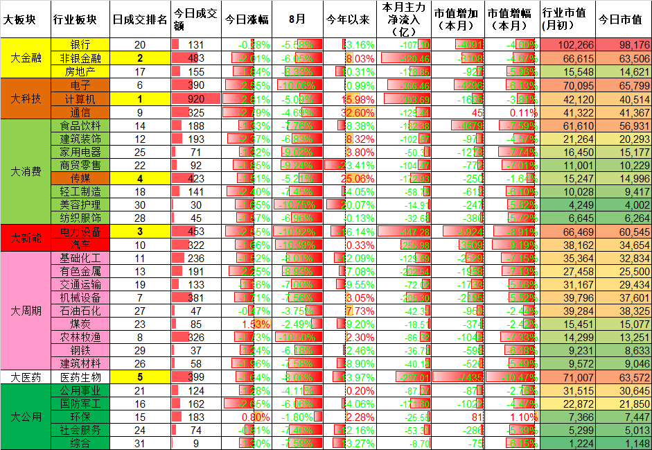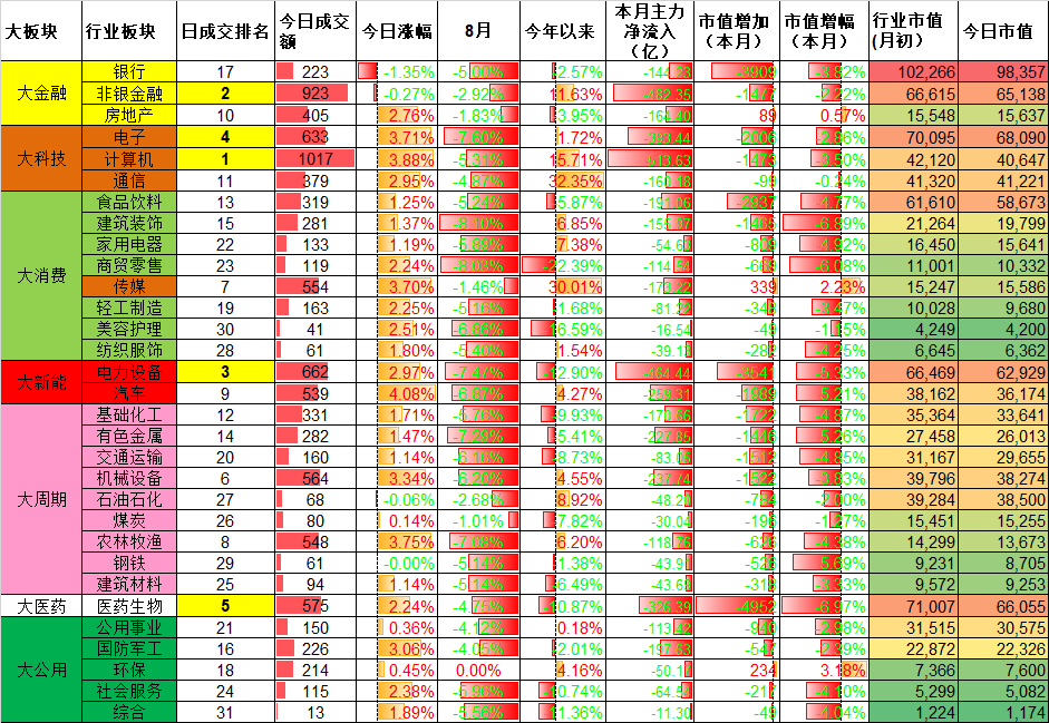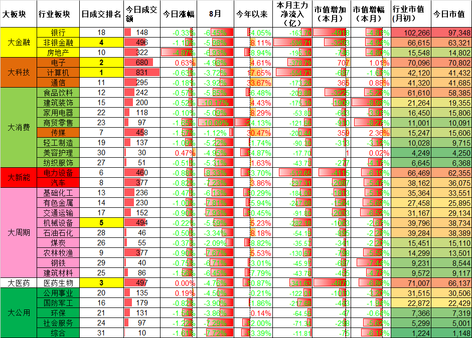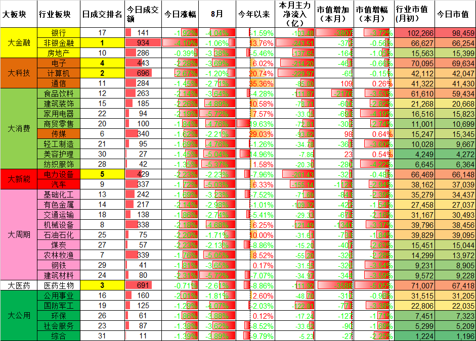 北向资金在连续净流出13天后,今天终于净买入了,是反弹还是反转拭目以待。核心还是观察汇率能否稳住。8月以来,各个板块跌的不少,中位数跌幅是本年最高的一个月。市场很少无脑单边涨或者单边跌,真单边涨跌就是牛熊了。