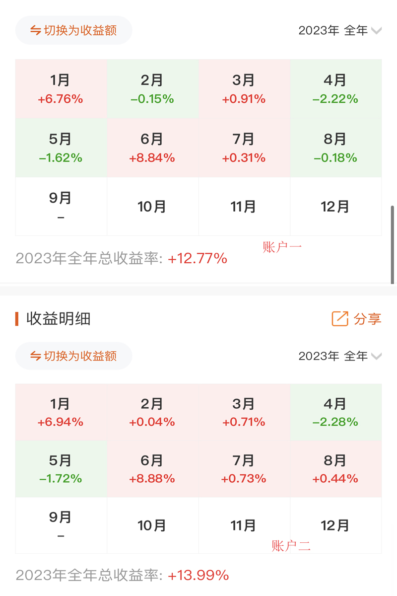账户二:日+1.23% 周+1.23% 月+3.99% 年+7.61%