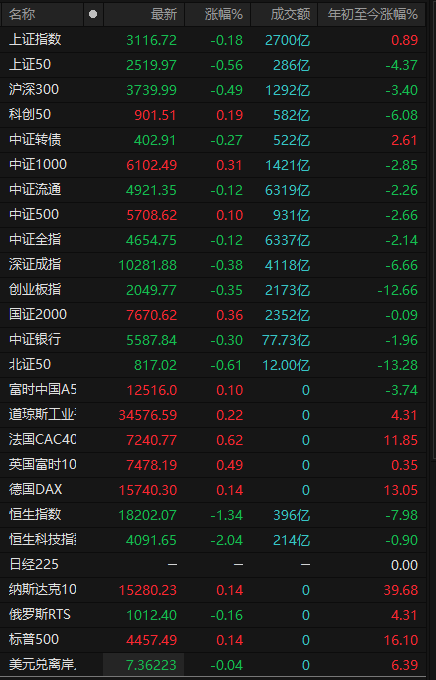 指数方面:北证50+0.11%、中证1000+0.03%、国证2000+0.01%领涨;科创50-0.65%、创业板指-0.59%、沪深300 -0.18%领跌。
