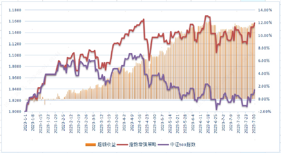 500增强策略7月增强仅有一个点,主要原因是转为了gamma偏正组合,但并没有等到爆发行情。8月份会按计划降低组合gamma,适当增加theta收入。