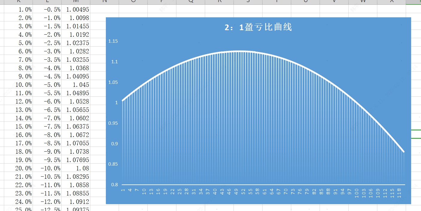 前两天有同事和我聊起投资私募产品回撤的问题,由于去年年底债券暴跌了一把,现在有的客户连固收债券产品也不敢买了。其实跟绝大多数事情一样,控制回撤这个问题也是过犹不及。假设投资的盈亏比是2:1,胜率是1:1,比如每次赚2%,下次亏1%。这样每2次的交易的盈利就是(1+2%)*(1-1%)-1=0.98%。按这个公式很容易算出来,到每次赚50%,下次亏25%的时候,盈利是最高的达到12.5%;而到100%/-50%,投资就进入了亏损状态。这应该是每个投资者的第一课。