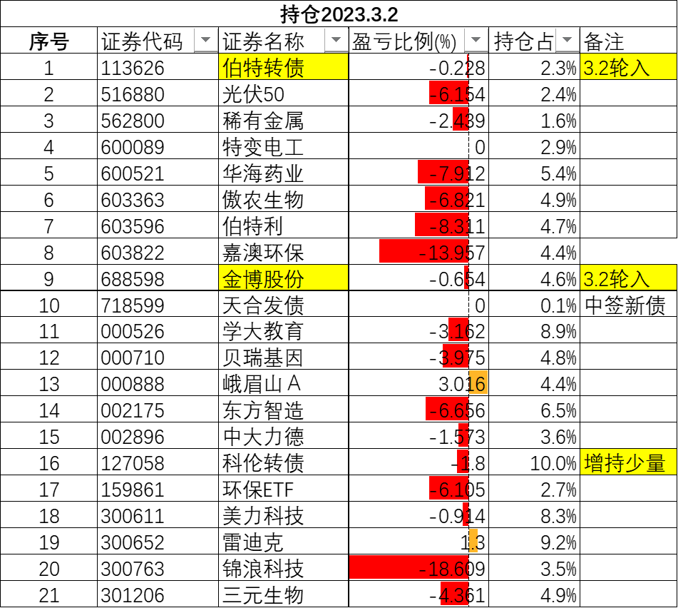 今天小账户上有1万块闲钱,中午看到贝斯转债盘中折价接近4%就买来玩玩。盈利1-2%没卖,等收盘折价几乎抹平,正股从高点回落幅度较大。尾盘亏2%卖了,纯玩,就不留着费神了。