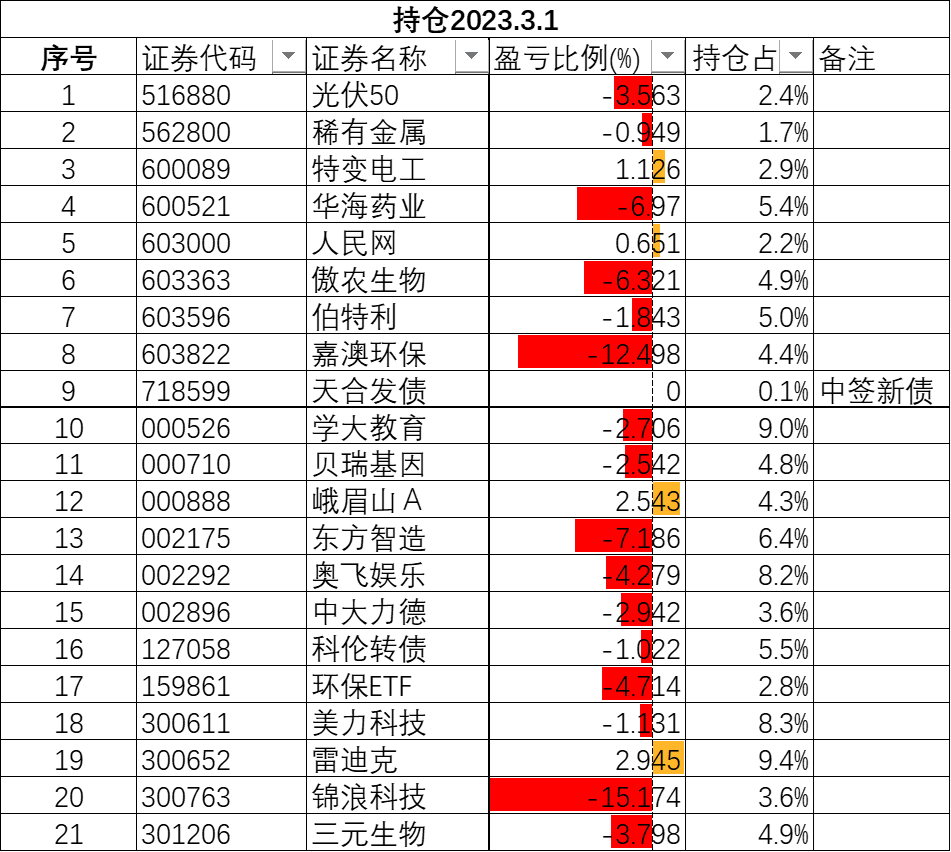 2.9本日:2.87%,跑赢指数本周:2.88%本月:3.92%本年:13.16%今天贡献中包括了新股湖南裕能。原来是开盘无脑卖出,管它什么价格。我认为市场是有效的,开盘价基本代表了市场情况。这个因为多看了下网络的定价分析,对它抱的期望较高,开盘63元左右没有无脑卖出。在收盘时集合竞价卖出了。这也是我一直说的,追求确定性可能是失败的根源。抛弃对确定性的追求,无脑按市场的,对于普通人来说同一标准的...蠢哭了,对于大幅波动的东西(例如新股),忘了用条件单自动交易。