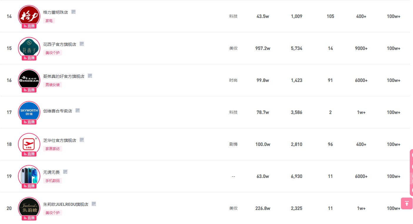 其实,现在头部直播间很多都是品牌旗舰店了,毕竟企业做直播间比个人有优势,有钱有人有策略。 格力直播间排在第十四位,这是董小姐经常会亲自上阵的直播间。