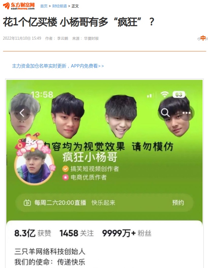 集思录上的人果然老了,小杨哥虽然没听说,但视频(直播)带货赚钱的逻辑是刚刚的啊,边娱乐(看),边消费(买),还有一丁点社交属性,是交易(各种商品,服务)的大势所趋啊。抖音兴趣电商的逻辑自己都没跑通。现在不过是吃了抖音流量的红利。