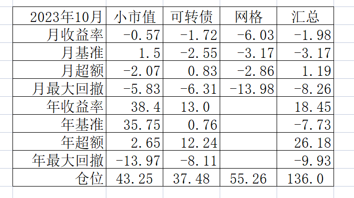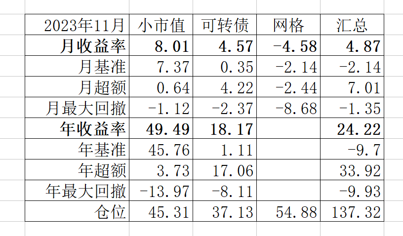 其中小市值策略+53.69%,多因子可转债+22.08%,ETF网格+1.8%;