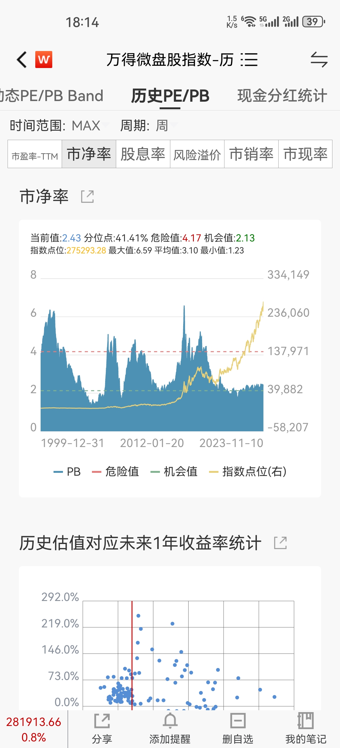 做个记录 万得微盘股指数市值中位数21.72,PB2.43,PB十年分位点49.22%