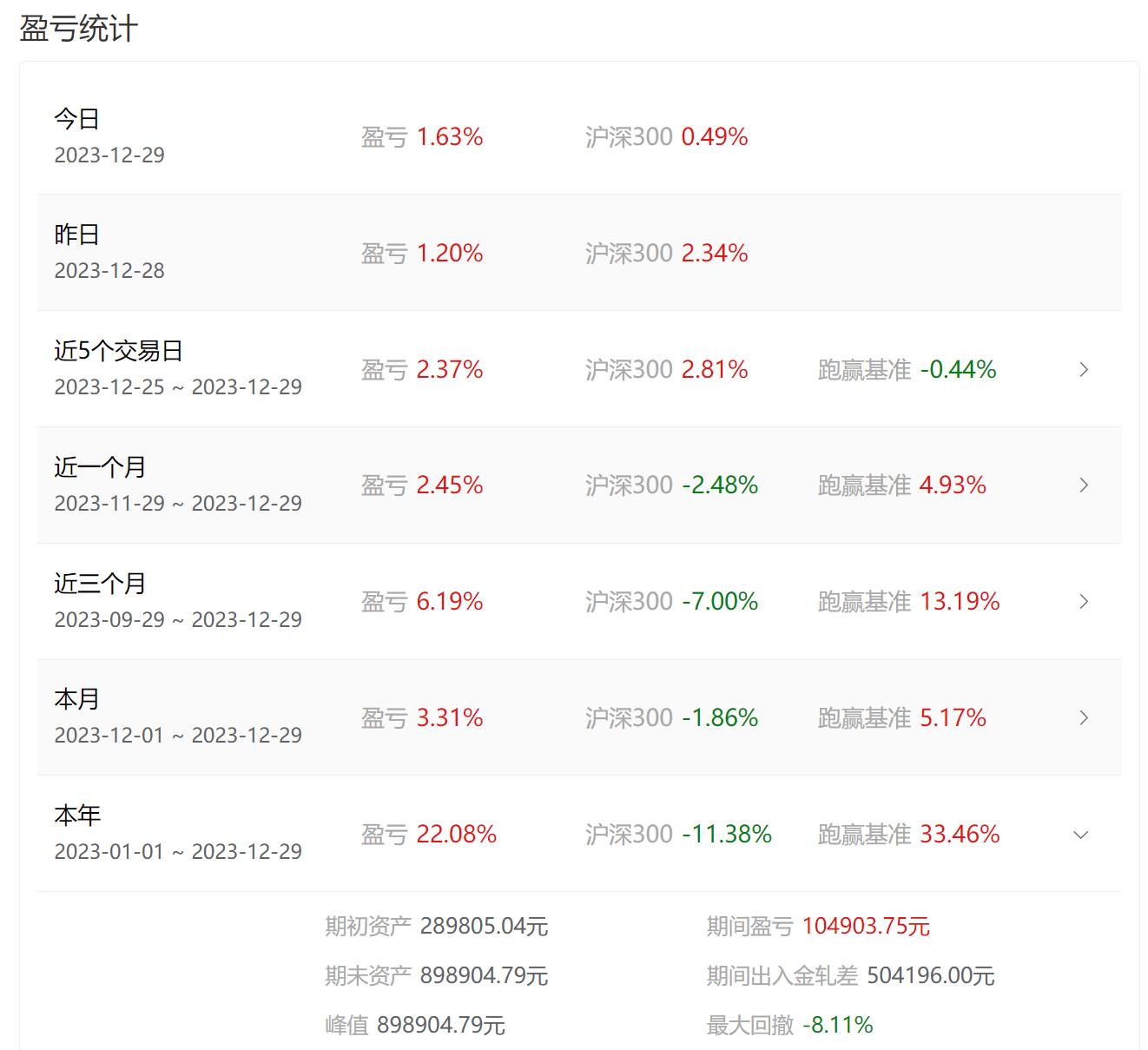 2023年全年收益率25.83%,45w;其中小市值策略+53.69%,多因子可转债+22.08%,ETF网格+1.8%,年初消费红利、绩优白马都是小幅割肉,纳指ETF早早就止盈只赚了1w+;中了3个新股,赚了1.5w,10个新债赚了2255。