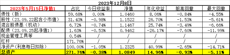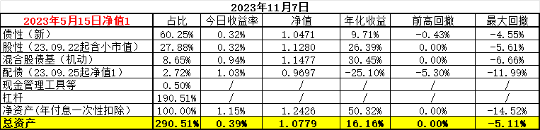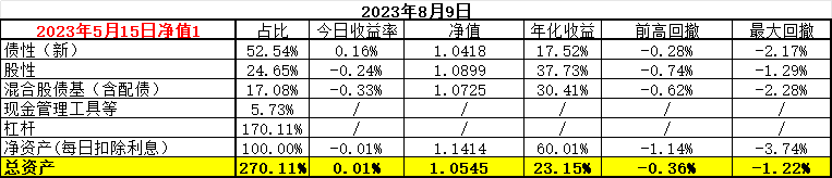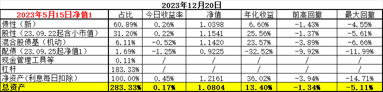 全面新高,配债账户由于是择时操作,一开始几乎没仓位时恰巧跌幅大,反弹时加仓导致用净值法计算涨幅较少,其实早就新高了,按现仓位计算盈利大概有10%