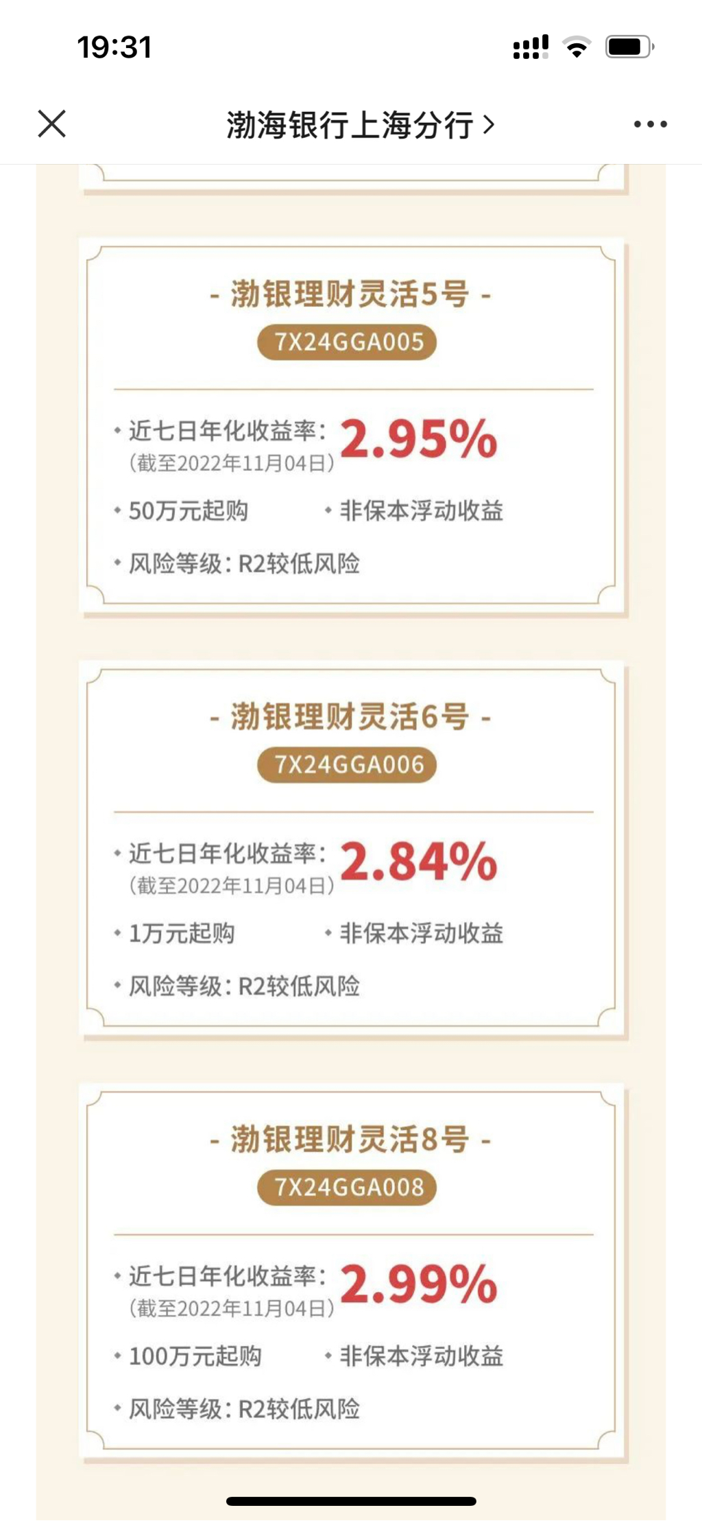 今天彻底退出渤海银行理财灵活8号,前期的利率还较高,所以前期全部买的渤海灵活8号,昨天用方盛申购退回的资金买渤海灵活8号,没想到收益率0.5%,好在没亏损。再见,渤海理财