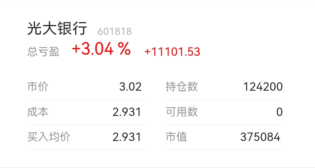 房地产史诗级利好,银行股基本无忧了,目前买入,至少可以安心睡大觉,至于能涨多少无所谓,每年都有分红拿不是吗?对于右侧交易的人来说,此时正好是买入良机。底部上来也才不到10%。个人认为大概率光大银行不会还钱。