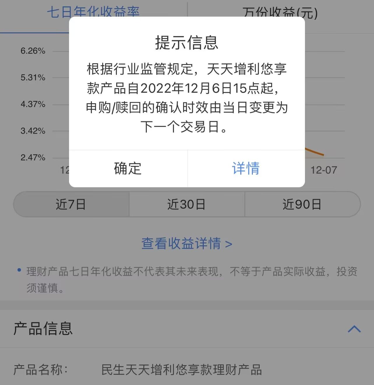 2.2022年12月9日(周五)15:00至12月10日(周六)12:00期间,本产品进行系统升级维护。预计2022年12月9日(周五)15:00至12月10日(周六)12:00期间,本产品暂停申购、赎回以及快速赎回等交易;2022年12月10日(周六)5:30至6:30期间,本产品暂停提供查询服务。如遇特殊情形,暂停交易及查询时间可能延长。系统升级维护期间,理财产品本身投资运作不受影响。请您提前做好资金安排,由此给您带来的不便,敬请谅解。