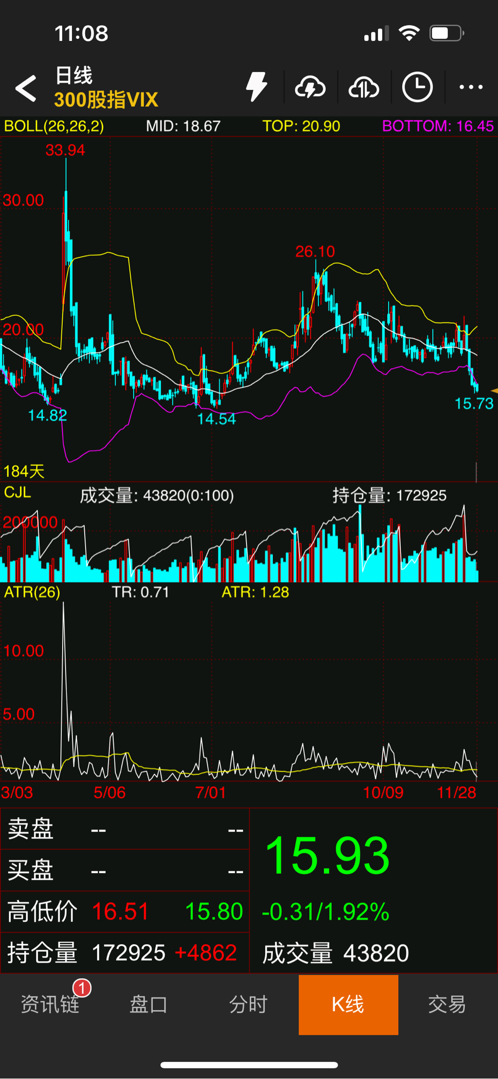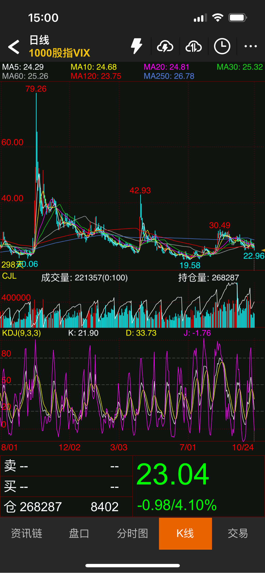 抛开情绪,好处是跌下去还有合约可以继续移仓,等下周看看有没有升波的机会。IO平值平移现在价差在70个点左右,期指略有贴水,VIX日线还是绿柱,尾盘有一点上升,下周等待更好的移仓机会。