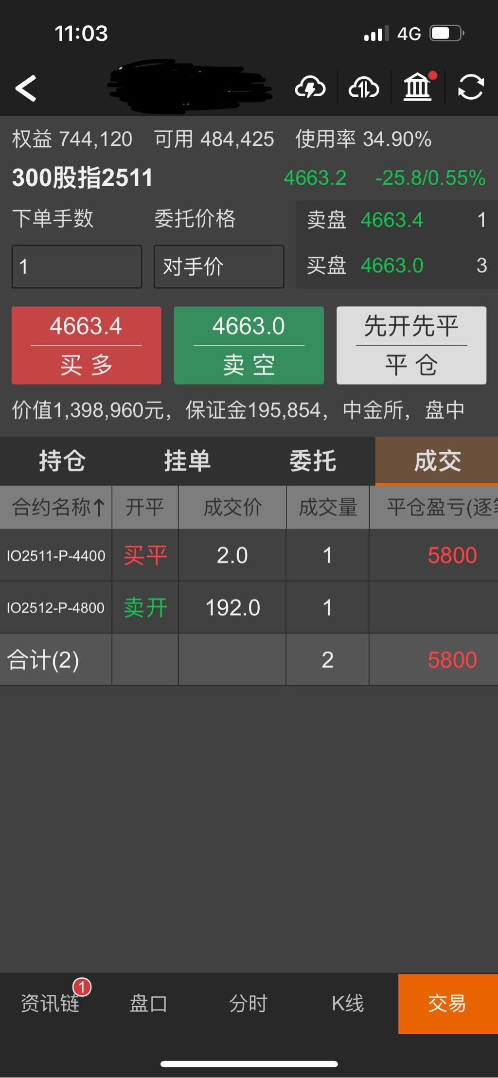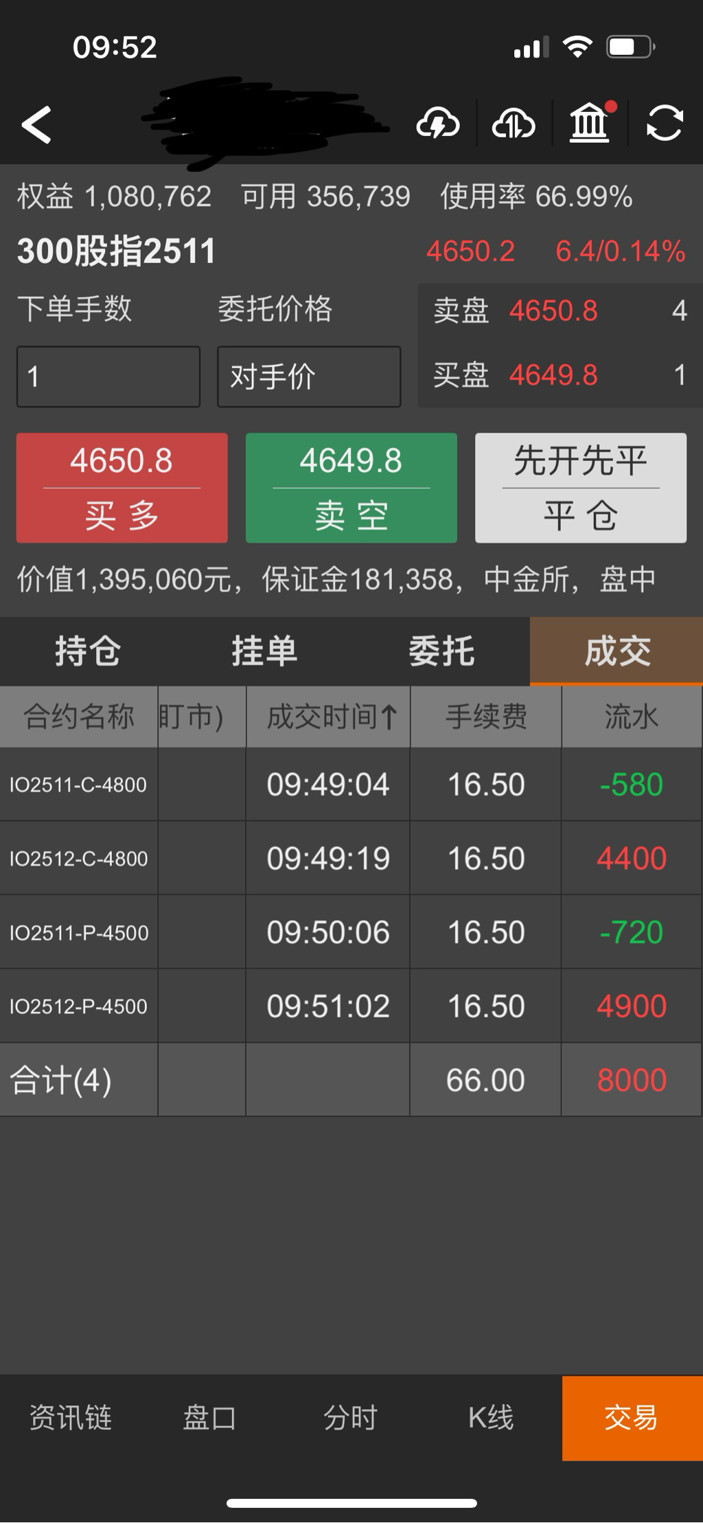 IO实盘账户是因为Delta不够了,所以上移4400卖沽到4800,移仓流水19000元。这个操作盈亏平衡点在4550点附近,指数如果大幅下跌是会亏损的。移仓时沪深300在4670点附近。遇更大的调整再上移可能会更好,各位同学不要学我上移那么多。单就这个IO卖沽4800而言,我是做好了浮亏的准备的,下跌再继续移仓虚值卖沽。宁愿被套,也不想踏空,囧!