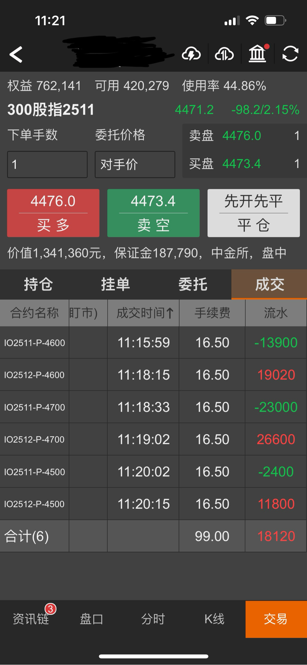 上证指数跌到了3840,移仓IO。沪深300在4500下方运行了,4700卖沽平仓亏损,3张卖沽平仓盈利4500元,移仓流水18120元。