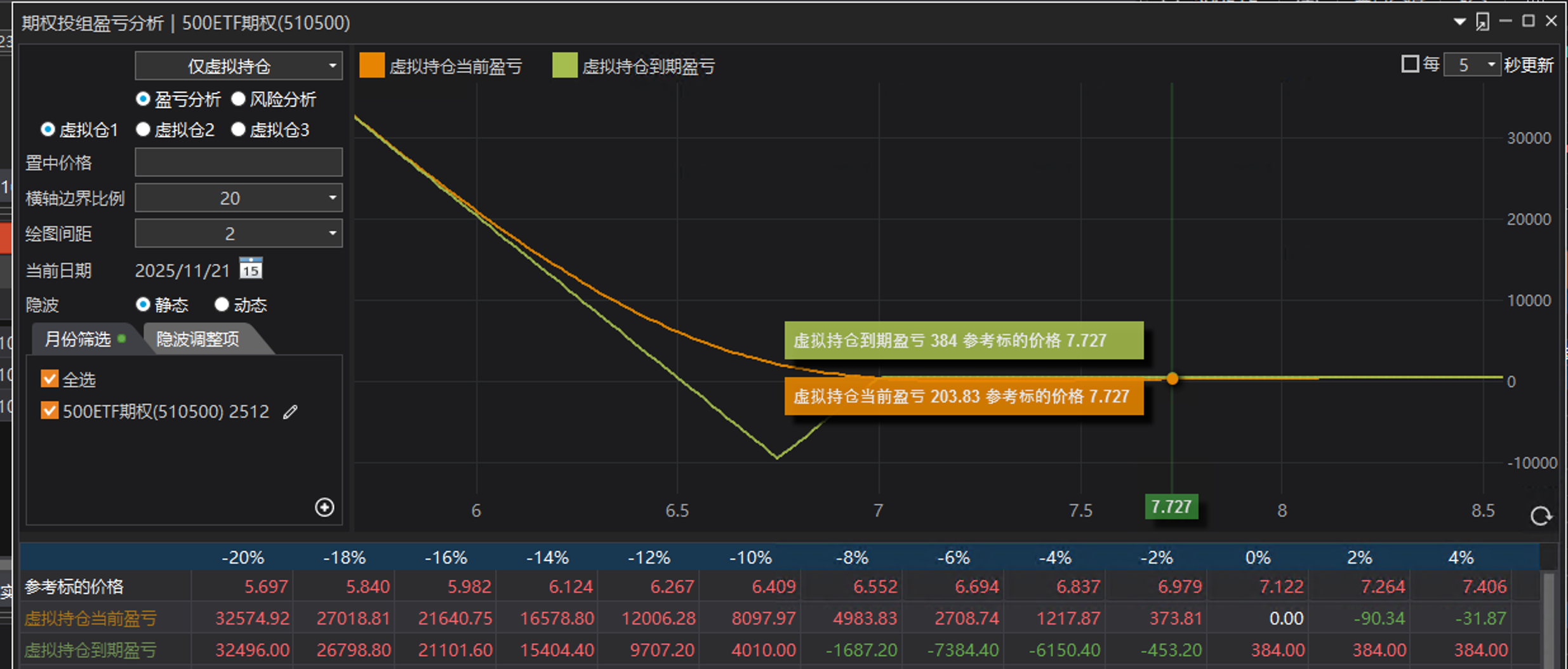 反向比例价差在这次下跌中的表现,我们先看近月。图中标的500ETF大跌,卖沽7000变实值了一张亏损925元,买沽6750一张盈利162元。可以计算这一组1:2的反向比例价差组合目前是浮亏的。