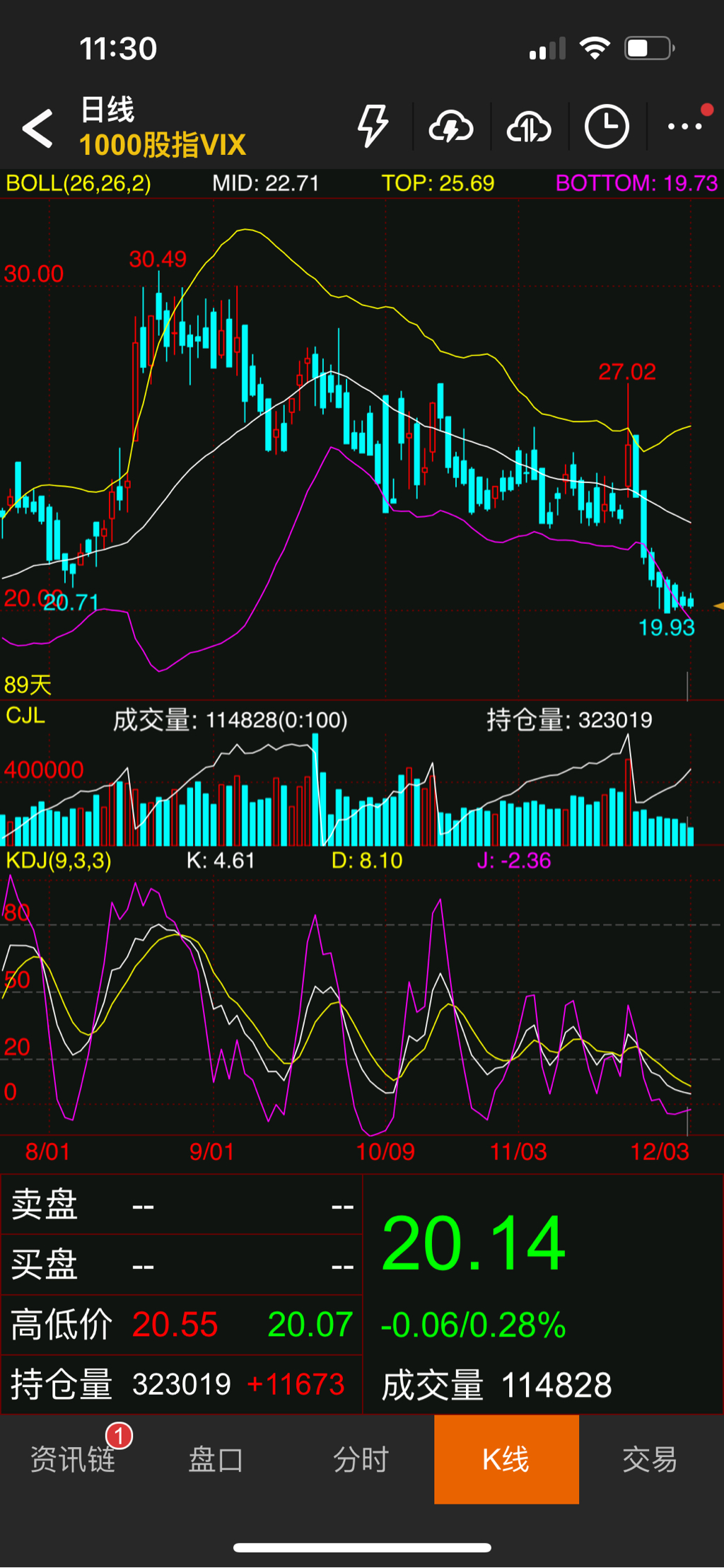 MO要不要开反向比例价差:MO隐波虽然走低,但是还不够低,另外1000均线交错。今天上证指数上破创新高,1000的走势也好起来了,我暂时不认为这里有加速下跌的迹象,升波也没有。目前MO我是偏多双卖持仓,买沽可以加到1:1,但是更高的比例大概可以等一等,除非你认为短期会有加速的回调。我认为现阶段持有铁鹰式是合适的,1000仍是一个区间震荡,比例买沽并不需要同时开仓,可以等铁鹰式赚钱了之后再择时判...老师:图中的成交量,持仓量是什么意思,VIX没有交易品种吧,谢谢