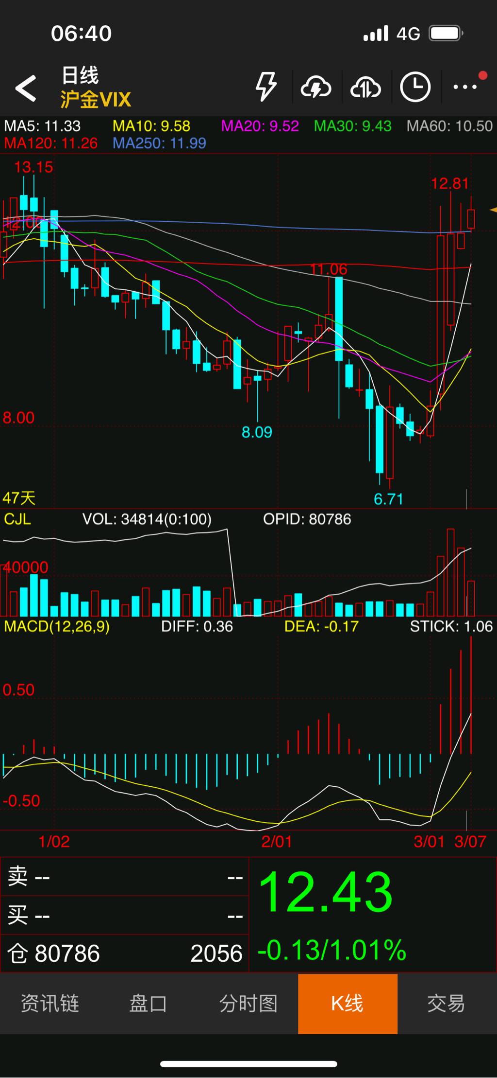 余力老师的建议是回落破了5日线再回补卖购仓位,这个可以参考,但是对于极端行情太慢了。极端升波的行情,看见波动率从日内最高点回落就可以动手了,看VIX,如果你短线盯盘,看自己的虚值购浮盈回落就可以,速度很快的。小仓位短线和止盈,不要指望一定在最尖尖上的那一点,浮盈不落袋回落也很快的。最极端的价格是空头爆仓了打出来的,你可以观察期权买购的极端涨幅大于股指期货大于ETF大于股票指数,昨天VIX和买购都出现了长长的上影线,但是极端价格的成交量不会很大。是因为空头回补首选平仓股指期货,昨天是股指期货涨停了没办法才高价买期权的。这种时间窗口是很小,你看尾盘IC和IM也涨停了,但是期权没有回到盘中的高位。